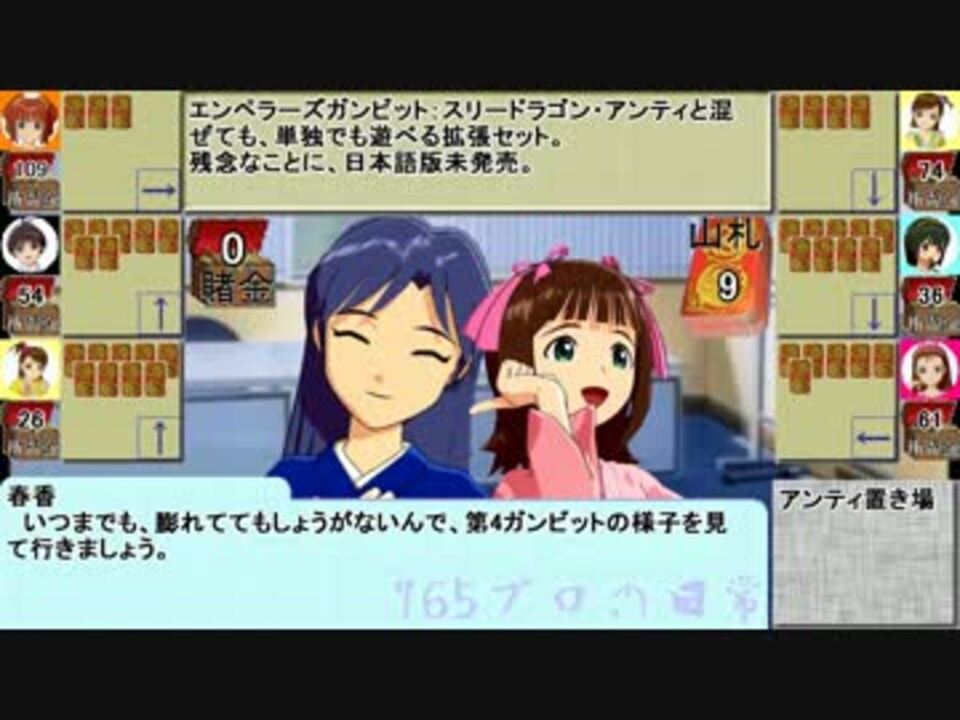 もう、新春って時期じゃねぇぞ!?<br />アイドルたちがスリードラゴン・アンティと言うカードゲームで、ひたすら対戦し続ける動画の新春スペシャル版です。<br />今回のメインの登場人物はやよい、伊織、真、小鳥さん、亜美真美、そして解説にはるちは。<br /><br /><br /><br /><a href="https://www.nicovideo.jp/watch/sm19991277" class="watch">sm19991277</a><前回<a href="https://www.nicovideo.jp/mylist/21971344" target="_blank" rel="noopener">mylist/21971344</a>>次回><a href="https://www.nicovideo.jp/watch/sm20223466" class="watch">sm20223466</a><br />ルール解説がメインの紹介_1><a href="https://www.nicovideo.jp/watch/sm6788480" class="watch">sm6788480</a><br />旧作マイリスト><a href="https://www.nicovideo.jp/mylist/10916387" target="_blank" rel="noopener">mylist/10916387</a> 新<a href="https://www.nicovideo.jp/mylist/34166487" target="_blank" rel="noopener">mylist/34166487</a><br /><br /> 紙芝居クリエーターの作者のすいぎんP様、架空戦記UPロダの神々をはじめとするツールと素材を提供してくださってる方々にはこの場を借りてお礼を申し上げます。<br /><br />