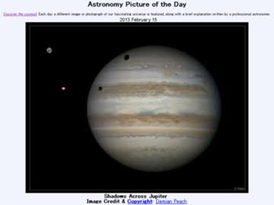 2月15日 Astronomy Picture of the Day - Shadows Across Jupiter 「木星を横切る二つの影」です。APODとはNASAが直近の天文現象に関する写真を、天文学者の説明を添えて毎日1枚公開しているサイトです。英語の勉強に読んでます。間違いがあれば指摘いただけると嬉しいです。美しい写真と原文:<a href="http://apod.nasa.gov/apod/ap130215.html" target="_blank" rel="noopener nofollow">http://apod.nasa.gov/apod/ap130215.html</a> お借りした音源様:パブリックドメイン wikipediaより APODreadingマイリスト <a href="https://www.nicovideo.jp/mylist/36151604" target="_blank" rel="noopener">mylist/36151604</a> (2013年2月分) (<a href="https://www.nicovideo.jp/watch/sm20100044" class="watch">sm20100044</a><前日 翌日><a href="https://www.nicovideo.jp/watch/sm20117851" class="watch">sm20117851</a>)