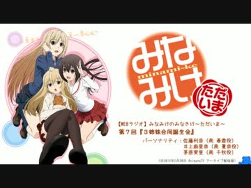 [AnimateTV 2013年2月20日アーカイブ配信]<br />第7回『3姉妹合同誕生会』<br />☆パーソナリティ:佐藤利奈(南 春香役)/井上麻里奈(南 夏奈役)/茅原実里(南 千秋役)<br /><br />☆さあ今回は3姉妹の合同誕生日会を行います。<br />なぜこの時期に?という疑問があるかもしれませんが、「間を取って」ということで、この2月に行わせて頂きます。<br />おなじみのアノ歌を歌うのも久々ですね。<br />ところでこの背後で鳴っている音は何でしょうか?.....(本家WEBより抜粋転載↓詳細はこちらから↓)<br />☆本家WEB:<font color="#3366ff"><a href="http://www.animate.tv/radio/details.php?id=minakike-4" target="_blank" rel="noopener nofollow">http://www.animate.tv/radio/details.php?id=minakike-4</a></font><br />(アニメイトTVWEB内の広告にも目を通して頂けると嬉しいです)<br /><br />●前回:<a href="https://www.nicovideo.jp/watch/sm20076174" class="watch">sm20076174</a><br />○次回:<a href="https://www.nicovideo.jp/watch/sm20200374" class="watch">sm20200374</a>(2/27追加)<br />●みなきけただいま一覧:<a href="https://www.nicovideo.jp/mylist/35454306" target="_blank" rel="noopener">mylist/35454306</a>