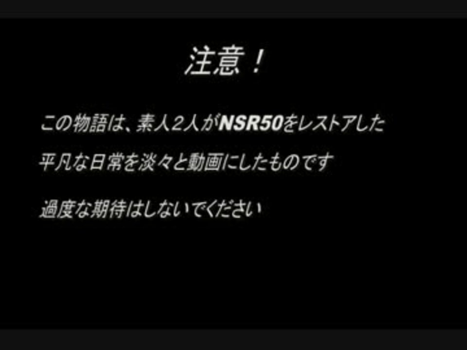 どうも、カニと申します。<br />今回はタビガラスさんという方からレストアベースのNSR50を譲って頂けるということで、<br />私と、流れ星さんでそのNSRをレストアしていく日常を動画にしたものです。<br /><br />何分、素人がやることなので過度な期待はしないで頂けると助かります。<br />ちなみにNSRの所有者になるのは流れ星さんです。確認。<br /><br />ゆっくりしっていってね! マイリスト <a href="https://www.nicovideo.jp/mylist/36200773" target="_blank" rel="noopener">mylist/36200773</a> 次回 <a href="https://www.nicovideo.jp/watch/sm20344297" class="watch">sm20344297</a>
