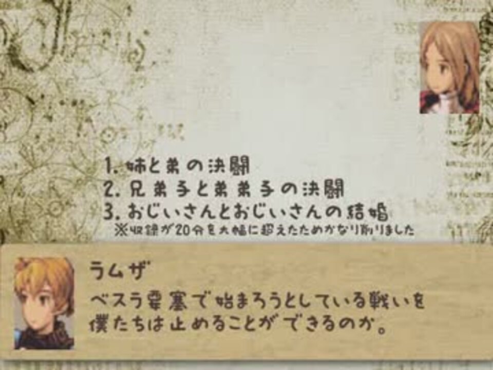 <font size="3"><b>FFTがもしももう少しだけハッピーな展開だったらどうなってたんだろう。</b></font><br />今回はベッド砂漠をクリア。リセット回数14。ちなみに妄想主はFFTの原作ストーリー大好き。<br /><br /><br /><b>前回</b>→<a href="https://www.nicovideo.jp/watch/sm19909496" class="watch">sm19909496</a><b> ハッピーなマイリスト</b>→<a href="https://www.nicovideo.jp/mylist/32464437" target="_blank" rel="noopener">mylist/32464437</a> <b>次回</b>→<a href="https://www.nicovideo.jp/watch/sm20337660" class="watch">sm20337660</a><br /><b>ハッピーなCM</b>→<a href="https://www.nicovideo.jp/mylist/35684796" target="_blank" rel="noopener">mylist/35684796</a><br /><b><font color="blue">Twitter</font></b>→<a href="http://twitter.com/mousouprincess2" target="_blank" rel="noopener nofollow">http://twitter.com/mousouprincess2</a><br /><b>おたより</b>→mousouprincess.<a href="https://ch.nicovideo.jp/channel/ch2" target="_blank" rel="noopener">ch2</a>@gmail.com<br /><br /><b>視聴者さんのイラスト</b>→<a href="https://seiga.nicovideo.jp/clip/809281" target="_blank" rel="noopener">clip/809281</a><br />