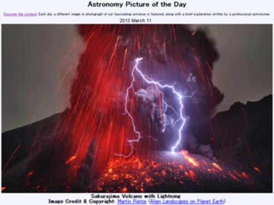 3月11日 Astronomy Picture of the Day - Sakurajima Volcano with Lightning 「稲妻光る桜島」です。APODとはNASAが直近の天文現象に関する写真を、天文学者の説明を添えて毎日1枚公開しているサイトです。英語の勉強に読んでます。間違いがあれば指摘いただけると嬉しいです。美しい写真と原文:<a href="http://apod.nasa.gov/apod/ap130311.html" target="_blank" rel="noopener nofollow">http://apod.nasa.gov/apod/ap130311.html</a> お借りした素材:wikipedia「桜島」記事より"Sakurajima55"by TANAKA Juuyoh 「Dirty thunderstorm」記事より"Rinjani 1994"by Oliver Spalt <a href="https://commons.nicovideo.jp/works/nc62576" target="_blank" rel="noopener">nc62576</a>より 雷 お借りした音源様:<a href="https://commons.nicovideo.jp/works/nc65234" target="_blank" rel="noopener">nc65234</a>「難問」by 天沼孝行 APODreadingマイリスト <a href="https://www.nicovideo.jp/mylist/37362932" target="_blank" rel="noopener">mylist/37362932</a>(2013年3月分) (<a href="https://www.nicovideo.jp/watch/sm20311312" class="watch">sm20311312</a><前日 翌日><a href="https://www.nicovideo.jp/watch/sm20328154" class="watch">sm20328154</a>)