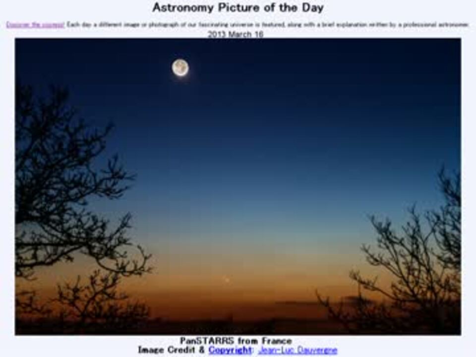 3月16日 Astronomy Picture of the Day - PanSTARRS from France 「フランスからのパンスターズ彗星」です。APODとはNASAが直近の天文現象に関する写真を、天文学者の説明を添えて毎日1枚公開しているサイトです。英語の勉強に読んでます。間違いがあれば指摘いただけると嬉しいです。美しい写真と原文:<a href="http://apod.nasa.gov/apod/ap130316.html" target="_blank" rel="noopener nofollow">http://apod.nasa.gov/apod/ap130316.html</a> お借りした素材:vimeoより "Cometa Pan-Starrs (C/2011 L4)"by bellatrix お借りした音源様:<a href="https://commons.nicovideo.jp/works/nc54579" target="_blank" rel="noopener">nc54579</a> APODreadingマイリスト <a href="https://www.nicovideo.jp/mylist/37362932" target="_blank" rel="noopener">mylist/37362932</a>(2013年3月分) (<a href="https://www.nicovideo.jp/watch/sm20354206" class="watch">sm20354206</a><前日 翌日><a href="https://www.nicovideo.jp/watch/sm20373707" class="watch">sm20373707</a>)