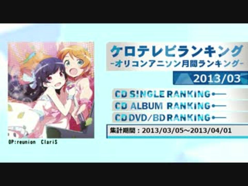 [HP]<a href="http://www20.atwiki.jp/keroro00innovator/" target="_blank" rel="noopener nofollow">http://www20.atwiki.jp/keroro00innovator/</a><br />デイリー:<a href="http://www20.atwiki.jp/keroro00innovator/pages/25.html" target="_blank" rel="noopener nofollow">http://www20.atwiki.jp/keroro00innovator/pages/25.html</a><br />週間:<a href="http://www20.atwiki.jp/keroro00innovator/pages/26.html" target="_blank" rel="noopener nofollow">http://www20.atwiki.jp/keroro00innovator/pages/26.html</a><br />2013年3月度のランキングです。<br />基本的にアニメソングのみ。除外基準:<a href="http://www20.atwiki.jp/keroro00innovator/pages/4.html" target="_blank" rel="noopener nofollow">http://www20.atwiki.jp/keroro00innovator/pages/4.html</a><br />2013年2月:<a href="https://www.nicovideo.jp/watch/sm20252562" class="watch">sm20252562</a> 2013年4月:<a href="https://www.nicovideo.jp/watch/sm20738346" class="watch">sm20738346</a> ランキング一覧:<a href="https://www.nicovideo.jp/mylist/22696553" target="_blank" rel="noopener">mylist/22696553</a><br />けいおん!総売上ランキング:<a href="https://www.nicovideo.jp/watch/sm20163444" class="watch">sm20163444</a>