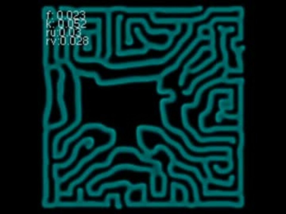 反応拡散系のシミュレーションです。<br /><br />単純な方程式から、様々な模様が生まれては消えていきます。たまにはコンピュータの描く"ぬるぬる"、"ふらふら"を楽しんでみてください。<br />ライフゲームと同じ「0人用ゲーム」ですが、系のパラメータを変更したり一部消して反応を見たりして遊んでいます。<br />個人的には50秒頃の迷路自動作成風の振る舞いが好きです。<br /><br />方程式は時間方向に1次の陽解法で解いています。<br />プログラムはC++、また可視化ではOpenGLを使用しています。<br /><br />今までアップロードしてきたもの <a href="https://www.nicovideo.jp/mylist/12203924" target="_blank" rel="noopener">mylist/12203924</a><br /><br />プログラムやソースコードなど詳細はblogまで。 <a href="http://elephnote.com/blog/archives/191" target="_blank" rel="noopener nofollow">http://elephnote.com/blog/archives/191</a>