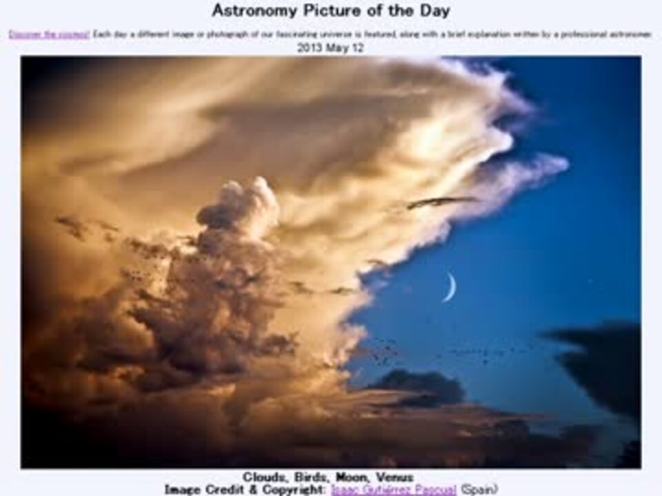 5月12日 Astronomy Picture of the Day - Clouds, Birds, Moon, Venus 「雲と鳥、月に明星」です。APODとはNASAが直近の天文現象に関する写真を、天文学者の説明を添えて毎日1枚公開しているサイトです。英語の勉強に読んでます。間違いがあれば指摘いただけると嬉しいです。美しい写真と原文:<a href="http://apod.nasa.gov/apod/ap130512.html" target="_blank" rel="noopener nofollow">http://apod.nasa.gov/apod/ap130512.html</a> お借りした素材:Flikcrより"Conjunction with a Cloud" and "Conjuction Night" by lrargerich お借りした音源様:<a href="https://commons.nicovideo.jp/works/nc66080" target="_blank" rel="noopener">nc66080</a>「草のかおりがしたよ」 by 天沼孝行 APODreadingマイリスト <a href="https://www.nicovideo.jp/mylist/37362944" target="_blank" rel="noopener">mylist/37362944</a>(2013年5月分) (<a href="https://www.nicovideo.jp/watch/sm20852427" class="watch">sm20852427</a><前日 翌日><a href="https://www.nicovideo.jp/watch/sm20868242" class="watch">sm20868242</a>)