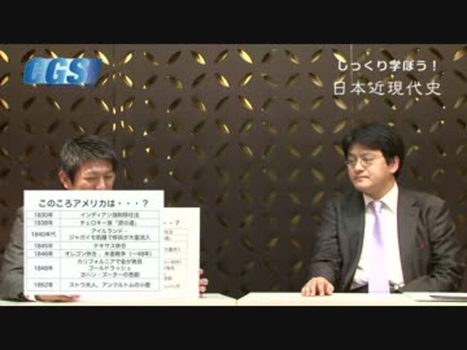 『じっくり学ぼう!日本近現代史』第3週ペリーが来る!だから、どうした?<br />第4話ペリー?誰、それ?<br />講師:憲政史家倉山満、聞き手:神谷宗幣<br />公式ブログ<a href="http://ameblo.jp/cgsinfo/" target="_blank" rel="noopener nofollow">http://ameblo.jp/cgsinfo/</a><br /><br />第3週 <a href="https://www.nicovideo.jp/mylist/37097043" target="_blank" rel="noopener">mylist/37097043</a> 第2週 <a href="https://www.nicovideo.jp/mylist/37011686" target="_blank" rel="noopener">mylist/37011686</a> 第1週 <a href="https://www.nicovideo.jp/mylist/36865837" target="_blank" rel="noopener">mylist/36865837</a><br /><br />今回は、いよいよ、日本を開国させて、近代国家への道を開いたともっぱらの噂のペリーが登場します。<br />ペリーが来日したとき、アメリカはどんな国だったのでしょう?そこから、日本との関係を再検討します。<br /><br />CGS FBPage <a href="http://www.facebook.com/ChGrandStrategy" target="_blank" rel="noopener nofollow">http://www.facebook.com/ChGrandStrategy</a>