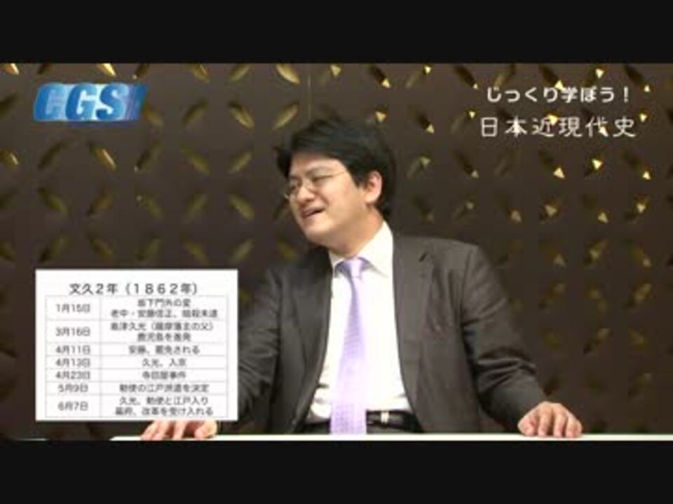 『じっくり学ぼう!日本近現代史』第4週激動の幕末へ!<br />第1話文久の改革〜かくして幕末動乱は始まった!<br />講師:憲政史家倉山満、聞き手:神谷宗幣<br />公式ブログ<a href="http://ameblo.jp/cgsinfo/" target="_blank" rel="noopener nofollow">http://ameblo.jp/cgsinfo/</a><br /><br />第4週 <a href="https://www.nicovideo.jp/mylist/37178633" target="_blank" rel="noopener">mylist/37178633</a> 第3週 <a href="https://www.nicovideo.jp/mylist/37097043" target="_blank" rel="noopener">mylist/37097043</a> <br />第2週 <a href="https://www.nicovideo.jp/mylist/37011686" target="_blank" rel="noopener">mylist/37011686</a> 第1週 <a href="https://www.nicovideo.jp/mylist/36865837" target="_blank" rel="noopener">mylist/36865837</a><br /><br />今週は、いよいよ歴史が大きく動き始めた、幕末動乱についてお送りします。<br />今回は、文久の改革です。目まぐるしく移り変わる政局に、時代はどのように動いていったのでしょうか?<br /><br />CGS FBPage <a href="http://www.facebook.com/ChGrandStrategy" target="_blank" rel="noopener nofollow">http://www.facebook.com/ChGrandStrategy</a>