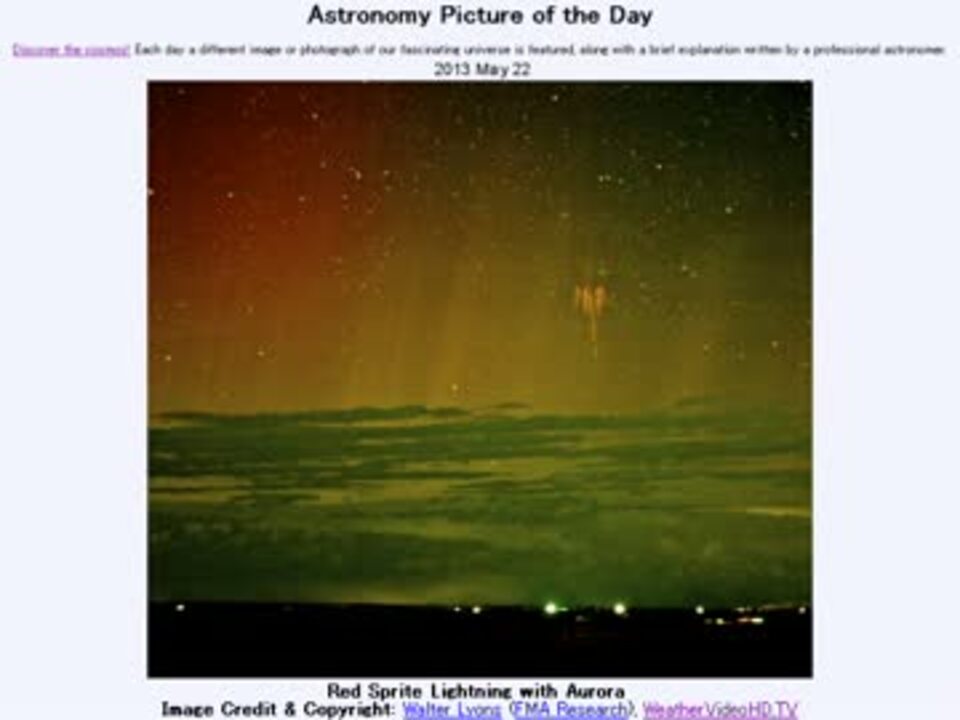 5月22日 Astronomy Picture of the Day - Red Sprite Lightning with Aurora 「オーロラとレッドスプライトの光」です。APODとはNASAが直近の天文現象に関する写真を、天文学者の説明を添えて毎日1枚公開しているサイトです。英語の勉強に読んでます。間違いがあれば指摘頂けると嬉しいです。美しい写真と原文:<a href="http://apod.nasa.gov/apod/ap130522.html" target="_blank" rel="noopener nofollow">http://apod.nasa.gov/apod/ap130522.html</a> お借りした素材:Wikipedia「Sprite (lightning)」より"Upperatmoslight1" by Abestrobi ,Youtubeより"Red Sprites & Blue Jets: Observations of High Altitude Atmospheric Flashes above Thunderstorms" by NASA お借りした音源様:<a href="https://commons.nicovideo.jp/works/nc55221" target="_blank" rel="noopener">nc55221</a>「妖精の森 リズム隊追加」 by VFR APODreadingマイリスト <a href="https://www.nicovideo.jp/mylist/37362944" target="_blank" rel="noopener">mylist/37362944</a>(2013年5月分) (<a href="https://www.nicovideo.jp/watch/sm20934588" class="watch">sm20934588</a><前日 翌日><a href="https://www.nicovideo.jp/watch/sm20949815" class="watch">sm20949815</a>) 字幕職人さん有難うございます!動画に有った、毎秒1万フレームで捉えたスプライト <a href="http://www.youtube.com/watch?v=JAssnAcHz6Y" target="_blank" rel="noopener nofollow">http://www.youtube.com/watch?v=JAssnAcHz6Y</a>