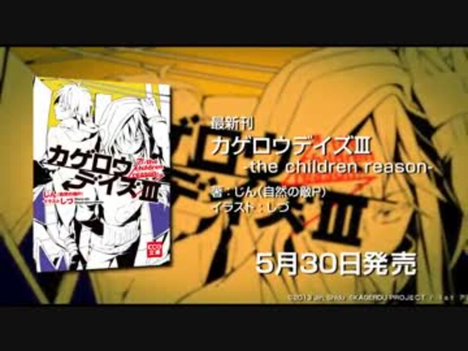 待望のノベライズ3巻が登場!「カゲロウデイズ」を攻略せよ!<br />KCG文庫(発行:エンターブレイン)<br />カゲロウデイズIII -the children reason-<br />2013年5月30日発売<br />定価 662円(税込)<br />著者:じん(自然の敵P)<br />イラスト:しづ<br /><br />とある夏の日に少年少女たちは出会った。<br />彼らが遭遇した非日常な体験に潜む「物語」とは?<br />すべてをつなぐリンクとは?<br />いま明らかになる驚愕のストーリー!<br />それぞれの「目」に宿る能力を武器に、メカクシ団に迫る謎を解き明かせ!<br />原作関連動画再生数1000万超の人気クリエイター・じん(自然の敵P)が自ら書き下ろした、待望のノベライズ3巻が登場!<br />『目』を奪われるような衝撃を見逃すな!<br /><br />CV:阿澄佳奈<br />