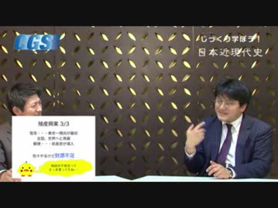 『じっくり学ぼう!日本近現代史』第6週明治維新〜先人たちの国創り<br />第3話地租改正と殖産興業〜強兵の前に、まず富国<br />講師:憲政史家倉山満、聞き手:神谷宗幣<br />公式ブログ(6/8日小池百合子先生公開収録!)<a href="http://ameblo.jp/cgsinfo/" target="_blank" rel="noopener nofollow">http://ameblo.jp/cgsinfo/</a><br /><br />第6週 <a href="https://www.nicovideo.jp/mylist/37338488" target="_blank" rel="noopener">mylist/37338488</a> 第5週 <a href="https://www.nicovideo.jp/mylist/37256029" target="_blank" rel="noopener">mylist/37256029</a> 第4週 <a href="https://www.nicovideo.jp/mylist/37178633" target="_blank" rel="noopener">mylist/37178633</a><br />第3週 <a href="https://www.nicovideo.jp/mylist/37097043" target="_blank" rel="noopener">mylist/37097043</a> 第2週 <a href="https://www.nicovideo.jp/mylist/37011686" target="_blank" rel="noopener">mylist/37011686</a> 第1週 <a href="https://www.nicovideo.jp/mylist/36865837" target="_blank" rel="noopener">mylist/36865837</a><br /><br />今週は、明治維新についてお送りしています。<br />今回は、富国強兵・殖産興業をスローガンに軍国主義まっしぐらに進んでいったと言われることもある、大日本帝国ですが、実際のところ富国のために、一体何をしていたのでしょう?<br /><br />CGS FBPage <a href="http://www.facebook.com/ChGrandStrategy" target="_blank" rel="noopener nofollow">http://www.facebook.com/ChGrandStrategy</a><br />Twitter @chgsinfo