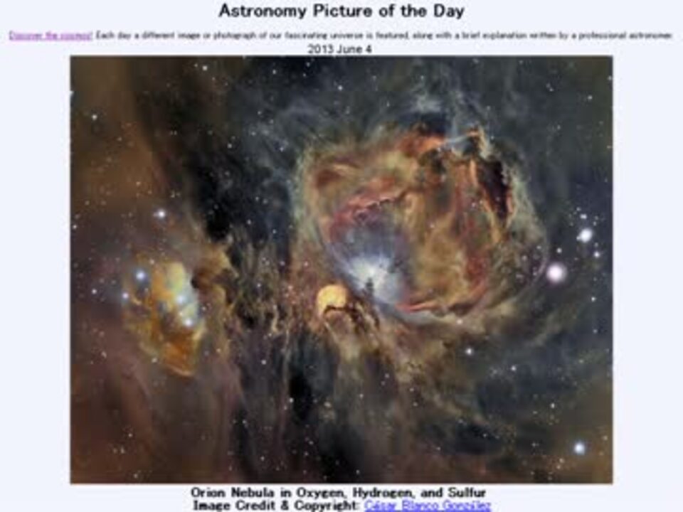 2013年6月4日 Astronomy Picture of the Day - Orion Nebula in Oxygen, Hydrogen, and Sulfur 「酸素・水素・そして硫黄のオリオン大星雲」です。APODとはNASAの天文学者が、毎日天文現象に関する1枚の写真に説明を添えて公開しているサイトです。英語の勉強に読んでます。間違いがあれば指摘頂けると嬉しいです。美しい写真と原文:<a href="http://apod.nasa.gov/apod/ap130604.html" target="_blank" rel="noopener nofollow">http://apod.nasa.gov/apod/ap130604.html</a> お借りした素材:Wikipedia「Betelgeuse」 記事より"Orion Head to Toe - Reduced" by Rogelio Bernal Andreo ,Flickrより"Orion constellation panorama" by Adam Evans お借りした音源:<a href="https://commons.nicovideo.jp/works/nc68719" target="_blank" rel="noopener">nc68719</a>「忘却街道」 by ポチ太郎 APODreadingマイリスト <a href="https://www.nicovideo.jp/mylist/38905378" target="_blank" rel="noopener">mylist/38905378</a>(2013年6月分) (<a href="https://www.nicovideo.jp/watch/sm21041164" class="watch">sm21041164</a><前日 翌日><a href="https://www.nicovideo.jp/watch/sm21054619" class="watch">sm21054619</a>)twitter:Cc_jabberwock ニコメンドに関連のAPODを載せたかったのですが、表示されないのでこちらに 星が生まれているオリオン大星雲 <a href="https://www.nicovideo.jp/watch/sm20003787" class="watch">sm20003787</a>
