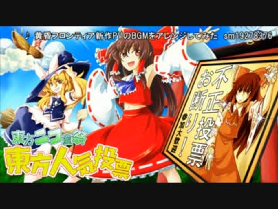 「東方人気投票」投票期間は終了しました。<br />結果発表までもう暫くお待ち下さい!<br />告知動画:<a href="https://www.nicovideo.jp/watch/sm20981003" class="watch">sm20981003</a><br /><br />【開催日】2013年 <font color="red">6月9日 0:00 ~ 6月16日 24:00</font><br />【部門】キャラ部門、音楽部門、ベストパートナー部門<br />【結果発表】第5回東方ニコ童祭2日目 6/30 0:00 動画+Webサイト<br /><br /><font color="red">「東方人気投票」は東方wiki様が開催されている「東方シリーズ人気投票」とは無関係のイベントです。</font><br />第5回東方ニコ童祭もヨロシク!:<a href="https://www.nicovideo.jp/watch/sm20896541" class="watch">sm20896541</a><br /><br />人気投票 特設ページ<br /><a href="http://nicodosai.com/vote/what" target="_blank" rel="noopener nofollow">http://nicodosai.com/vote/what</a><br />投票ページ<br /><a href="http://vote.nicodosai.com/" target="_blank" rel="noopener nofollow">http://vote.nicodosai.com/</a><br /><br />コミュニティ:co287151<br />Twitter:@nicodosai<br />マイリスト:<a href="https://www.nicovideo.jp/mylist/36507719" target="_blank" rel="noopener">mylist/36507719</a>