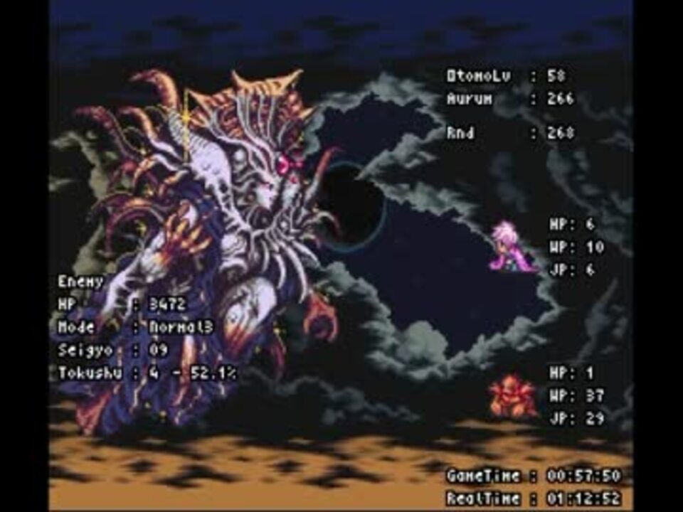 ボストンカウンターチャートで作ってみました<br />振り逃げダイナミック、実体化等のメモリ破壊バグのみ禁止してます<br />破壊するものは本当にハゲそうでした…<br />Frames:265479 Re-record Count:121624<br />訂正 0:47→×デット○デッド<br /> <br />Part4→<a href="https://www.nicovideo.jp/watch/sm21180198" class="watch">sm21180198</a> まとめ→<a href="https://www.nicovideo.jp/mylist/37501973" target="_blank" rel="noopener">mylist/37501973</a> その他の動画→<a href="https://www.nicovideo.jp/mylist/24782043" target="_blank" rel="noopener">mylist/24782043</a><br />【形態変化の仕組み】<br />Seigyo→制御値<br />通常形態変化に影響。トータルエクリプス発動しなかった時に<b>int[(制御値mod16)/4]+1</b>の形態に移行<br />ダメージ計算時に判定。分身技は攻撃回数ごとにダメージ計算があるので判定回数が増えて増加しやすくなります<br />Tokushu→特殊変化値<br />トータルエクリプス発動確率に影響。<br />%表示はそのターン最後に発動する確率の目安にどうぞ