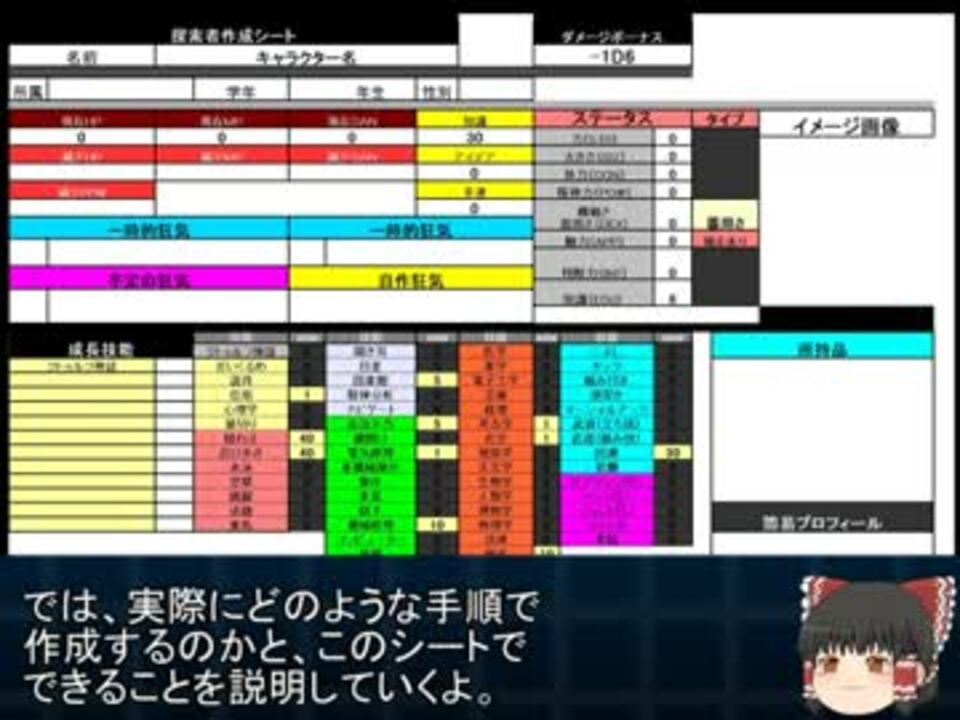 <a href="https://www.nicovideo.jp/watch/sm21258904" class="watch">sm21258904</a> さらに手軽に、さらに簡単に作れるようになったよ!<br /><br /><br />このシートはフリーエクセルソフト「OpenOffice」を使用して作成されています。<br />そのため、通常のエクセルで開いた場合関数が破損し、正しくステータスが表示されません。ご了承ください。<br />要望が多い場合はエクセル対応バージョンも作成しようと思っています。<br /><br />【配布場所】次の動画記載<br /><br />このシートでは以下の作業を行うことで<br />『キャラクター情報』『キャラクター技能』『成長技能(ステータス)』<br />を自動で計算し、反映してくれるものです。<br /><br />【必要作業】<br />『キャラクター基礎情報の記入』<br />『1~100の乱数記入』<br />『技能配分』<br />