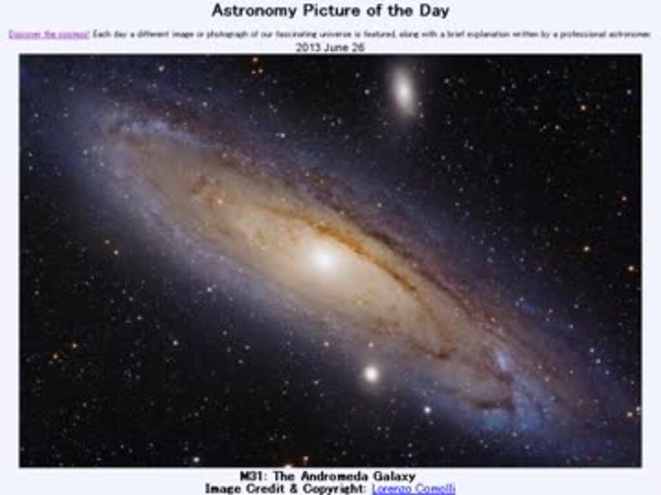 2013年 6月26日 Astronomy Picture of the Day - M31: The Andromeda Galaxy 「M31:アンドロメダ銀河」です。APODとはNASAの天文学者が、毎日天文現象に関する1枚の写真に説明を添えて公開しているサイトです。英語の勉強に読んでます。間違いがあれば指摘頂けると嬉しいです。美しい写真と原文:<a href="http://apod.nasa.gov/apod/ap130626.html" target="_blank" rel="noopener nofollow">http://apod.nasa.gov/apod/ap130626.html</a> お借りした素材:Wikipedia「Messier-Katalog」より"Bildtafel Messierobjekte"(著作権者多数につき割愛:<a href="http://de.wikipedia.org/wiki/Datei:Bildtafel_Messierobjekte.jpg)" target="_blank" rel="noopener nofollow">http://de.wikipedia.org/wiki/Datei:Bildtafel_Messierobjekte.jpg)</a> お借りした音源:<a href="https://commons.nicovideo.jp/works/nc72015" target="_blank" rel="noopener">nc72015</a>「The star lights」 by 黒メガネP APODreadingマイリスト <a href="https://www.nicovideo.jp/mylist/38905378" target="_blank" rel="noopener">mylist/38905378</a>(2013年6月分) (<a href="https://www.nicovideo.jp/watch/sm21217163" class="watch">sm21217163</a><前日 翌日><a href="https://www.nicovideo.jp/watch/sm21229253" class="watch">sm21229253</a>)twitter:Cc_jabberwock ニコメンドに関連のAPODを載せてあります。興味を持たれた方は是非ご覧下さい。解らないことが有ったら気軽にお尋ねください。