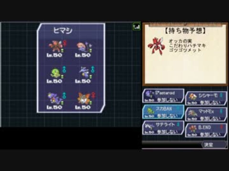 予選第4戦目、暇士さんとの対戦をお送りします。<br />お前誰や!<br /><br />【動画の流れ】<br />茶番 <a href="#" class="seekTime" data-seekTime="0:01" onclick="seekNicoPlayer('#0:01'); return false;">#0:01</a> OP <a href="#" class="seekTime" data-seekTime="0:35" onclick="seekNicoPlayer('#0:35'); return false;">#0:35</a> 待機画面 <a href="#" class="seekTime" data-seekTime="2:08" onclick="seekNicoPlayer('#2:08'); return false;">#2:08</a> 対戦開始 <a href="#" class="seekTime" data-seekTime="18:32" onclick="seekNicoPlayer('#18:32'); return false;">#18:32</a><br /><br /><font color="red">【注意事項】</font><br /><font color="red">・対戦結果のネタバレ、対戦相手の誹謗中傷コメントはNG、ひどいときは削除対象になります。</font><br /><font color="red">・アグノムは絶対選出ではありません。</font><br /><br />次:【<a href="https://www.nicovideo.jp/watch/sm21973382" class="watch">sm21973382</a>】<br />前:【<a href="https://www.nicovideo.jp/watch/sm21111098" class="watch">sm21111098</a>】<br />暇士さん視点:【<a href="https://www.nicovideo.jp/watch/sm21228391" class="watch">sm21228391</a>】<br />大会マイリスト:【<a href="https://www.nicovideo.jp/mylist/37146439" target="_blank" rel="noopener">mylist/37146439</a>】<br />BW2マイリスト:【<a href="https://www.nicovideo.jp/mylist/33127413" target="_blank" rel="noopener">mylist/33127413</a>】<br /><br />ツイッター:@amyu18<br />連絡先:amyu.niconico@gmail.com<br />生放送コミュニティ:co1011054<br /> ブログ:<a href="http://amyu318.blog.fc2.com/" target="_blank" rel="noopener nofollow">http://amyu318.blog.fc2.com/</a>