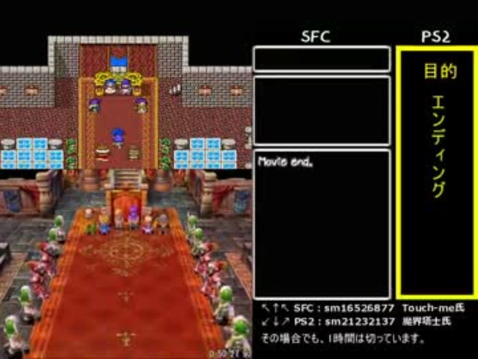 奇しくもどっちも50分強でクリアだったので出来心でやってしまった(ゴメンナサイ)。<br />ついでに<font color="red">速度を3倍に</font>。元の速度で見たい場合は下記本家動画様または<a href="https://www.nicovideo.jp/watch/sm21249138" class="watch">sm21249138</a>を見て下さい。<br /><br /><b>本家動画様</b><br />SFC版(最終入力 50分20秒) Touch-me氏: <a href="https://www.nicovideo.jp/watch/sm16526862" class="watch">sm16526862</a> / <a href="https://www.nicovideo.jp/watch/sm16526877" class="watch">sm16526877</a> <br />PS2版(最終入力 50分12秒) 魔界塔士氏: <a href="https://www.nicovideo.jp/watch/sm21231862" class="watch">sm21231862</a> / <a href="https://www.nicovideo.jp/watch/sm21232006" class="watch">sm21232006</a> / <a href="https://www.nicovideo.jp/watch/sm21232137" class="watch">sm21232137</a> <br /><br /><br />※両方の動画を合わせただけです。解説メッセージは本家動画でのものです。<br /> ただし3倍速にするとPS2版のゆっくりが酷いことになったので、音声のみ無編集版の方を使用しています。<br /> 1画面内へ強引に収めるため、元動画よりレイアウトを少し変更しています。<br />