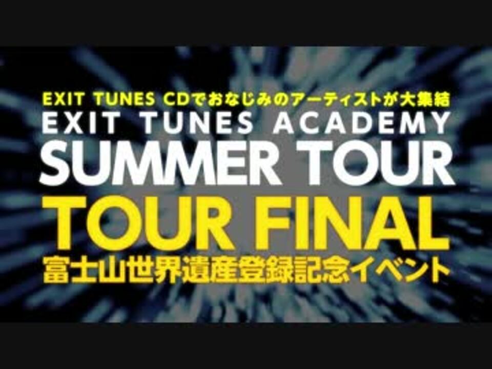 <font size="3" color="#ff00ff"><b>EXIT TUNES ACADEMY SUMMER TOUR 2013<br />~TOUR FINAL 富士山世界遺産登録記念イベント~<br /></font><br />[会場]静岡市民文化会館 大ホール(静岡)<br />[開場/開演] 16:30/17:30<br /><br />[チケット料金] 5,000円(税込)<br /><font size="3" color="#ff0000">7/20(土)AM10:00より各プレイガイドにて一般販売開始!!<br /></font><br />[出演者]亜沙 / add9(ヘリP) / __(アンダーバー) / 164 / ぐるたみん / しゃむおん / スズム / Starving Trancer(Another Infinity) feat. Mayumi Morinaga / 赤飯 / DJ UTO /デッドボールP / 灯油 / ふわりP / 松下 / みきとP / りょーくん / YM / Neru 他<br />※出演者は、変更になる場合があります。予めご了承ください。<br /><br />ETA公式HP : eta.jp</b>