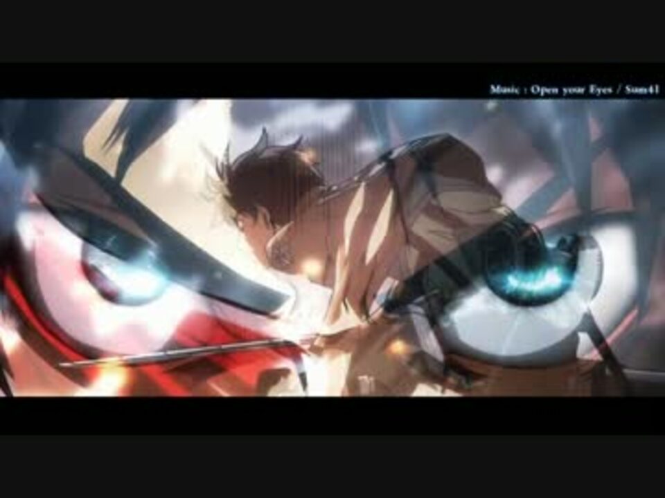 <font color="#ff1919" size=5.5>「人類が今日、初めて巨人に勝ったよ・・・」</font><br /><br />■Music:Open Your Eyes / Sum41<br /><br />■個人的おすすめシーン → <a href="#" class="seekTime" data-seekTime="1:57" onclick="seekNicoPlayer('#1:57'); return false;">#1:57</a><br /><br /><br />--------------------------------------------------------------------------<br /><br />■Movie:√未空-misora <a href="https://www.nicovideo.jp/mylist/33594721" target="_blank" rel="noopener">mylist/33594721</a><br /><br />■使用ソフト:Aviutl<br /><br />--------------------------------------------------------------------------<br /><br /><font color="#ff1919">処女作 【進撃の巨人 MAD】 The Walk → <a href="https://www.nicovideo.jp/watch/sm20818761" class="watch">sm20818761</a> <br /><br /></font><br /><br /><br />※13話までネタバレ<br /><br /> MAD内で好きなシーンあったらコメくれると嬉しいです!<br /><br /><br />
