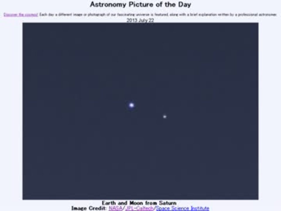 2013年7月22日 Astronomy Picture of the Day - Earth and Moon from Saturn 「土星からの地球と月」です。APODとはNASAの天文学者が、毎日天文に関する画像に説明を添えて公開しているサイトです。英語の勉強に読んでます。間違いがあれば指摘頂けると嬉しいです。美しい写真と原文:<a href="http://apod.nasa.gov/apod/ap130722.html" target="_blank" rel="noopener nofollow">http://apod.nasa.gov/apod/ap130722.html</a> お借りした素材:Youtubeより"Cloud Chamber" by Stephen Curry お借りした音源:<a href="https://commons.nicovideo.jp/works/nc27214" target="_blank" rel="noopener">nc27214</a>「遠い海の向こうに、遥かに」 by Ambient Samurai APODreadingマイリスト <a href="https://www.nicovideo.jp/mylist/38905578" target="_blank" rel="noopener">mylist/38905578</a>(2013年7月分) (<a href="https://www.nicovideo.jp/watch/sm21419271" class="watch">sm21419271</a><前日 翌日><a href="https://www.nicovideo.jp/watch/sm21434212" class="watch">sm21434212</a>)twitter:Cc_jabberwock 転載はご遠慮下さい。解らない事が有ったら気軽にお尋ね下さい。解る範囲内ですがお答えします