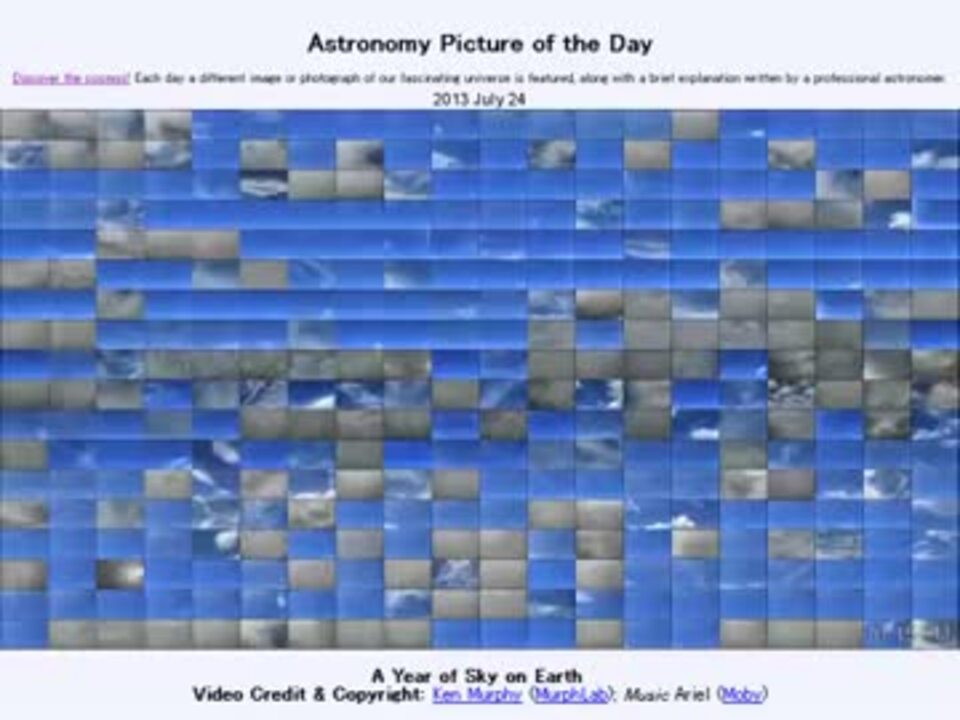 2013年 7月24日 Astronomy Picture of the Day - A Year of Sky on Earth 「地球の空の1年」です。APODとはNASAの天文学者が、毎日天文に関する画像に説明を添えて公開しているサイトです。英語の勉強に読んでます。間違いがあれば指摘頂けると嬉しいです。美しい写真と原文:<a href="http://apod.nasa.gov/apod/ap130724.html" target="_blank" rel="noopener nofollow">http://apod.nasa.gov/apod/ap130724.html</a> APODreadingマイリスト <a href="https://www.nicovideo.jp/mylist/38905578" target="_blank" rel="noopener">mylist/38905578</a>(2013年7月分) (<a href="https://www.nicovideo.jp/watch/sm21434212" class="watch">sm21434212</a><前日 翌日><a href="https://www.nicovideo.jp/watch/sm21453331" class="watch">sm21453331</a>)twitter:Cc_jabberwock 転載はご遠慮下さい。解らない事が有ったら気軽にお尋ね下さい。解る範囲内ですがお答えします編集の関係上、2倍速ほどになっております。是非オリジナルを見に行ってみてください。