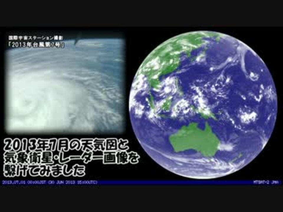 梅雨・猛暑・局地的大雨 色んな意味で記録的な1ヶ月、<br />そんな2013年7月の天気図と気象衛星・レーダー画像を繋げてみました。<br /><br />・映像は 気象庁 で公開されている画像を動画化しています<br /> <a href="http://www.jma.go.jp/" target="_blank" rel="noopener nofollow">http://www.jma.go.jp/</a><br />・BGMは SHO(キセノンP)さんによる ひまわり -Good Night Version- <br /> <a href="https://www.nicovideo.jp/watch/sm15075032" class="watch">sm15075032</a> (使用曲はインスト版) より<br /><br />■2013年6月衛星画像(<a href="https://www.nicovideo.jp/watch/sm21248954" class="watch">sm21248954</a>)←前 次→2013年8月(<a href="https://www.nicovideo.jp/watch/sm21727366" class="watch">sm21727366</a>)<br /> マイリスト:月刊 <a href="https://www.nicovideo.jp/mylist/21644544" target="_blank" rel="noopener">mylist/21644544</a> 年刊 <a href="https://www.nicovideo.jp/mylist/21644629" target="_blank" rel="noopener">mylist/21644629</a><br /><font color="#ffffff"> マイリスト:</font>増刊 <a href="https://www.nicovideo.jp/mylist/28093639" target="_blank" rel="noopener">mylist/28093639</a><br /><font size="1">※掲載データは速報値を使用している為、後日変更される可能性がございます。<br /> また富士山と南極昭和基地での観測値は、除外しています。</font>