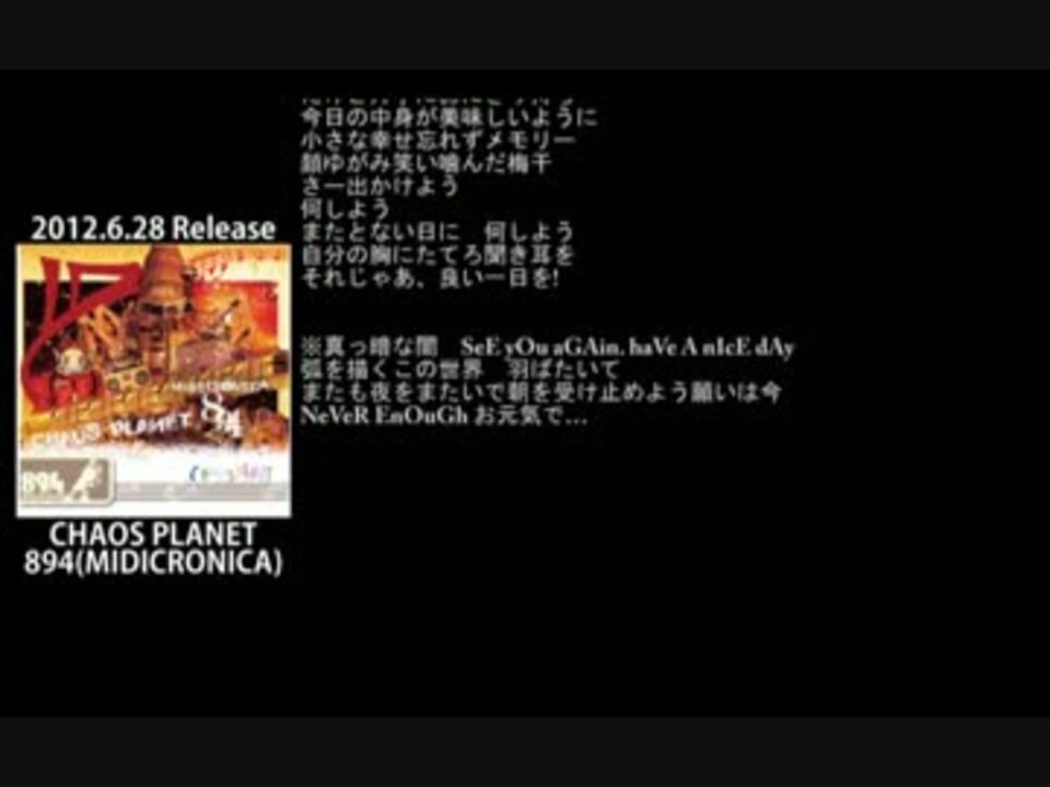 894(MIDICRONICA)<br />iTunes:<a href="http://goo.gl/gJZuEX" target="_blank" rel="noopener nofollow">http://goo.gl/gJZuEX</a><br />Twitter:<a href="https://twitter.com/midicronica894" target="_blank" rel="noopener nofollow">https://twitter.com/midicronica894</a><br />HP:<a href="http://midicronica.com/" target="_blank" rel="noopener nofollow">http://midicronica.com/</a><br />BLOG:<a href="http://ameblo.jp/jigokuiki/" target="_blank" rel="noopener nofollow">http://ameblo.jp/jigokuiki/</a><br />MIDICRONICA SHOP:<a href="http://midicronica.shop-pro.jp/" target="_blank" rel="noopener nofollow">http://midicronica.shop-pro.jp/</a><br />2012.6.28 Release 894(MIDICRONICA) ソロアルバム[CHAOS PLANET]からFAtE feat エムラスタ(Romancrew)のリリックビデオを公開。