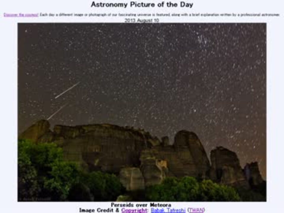 2013年8月9日<br />Astronomy Picture of the Day - Perseids over Meteora 「メテオラに降るペルセウス座流星群」です。<br /><br />APODとはNASAの天文学者が、毎日天文に関する画像に説明を添えて公開しているサイトです。<br />英語の勉強に読んでます。間違いがあれば指摘頂けると嬉しいです。<br /><br />美しい写真と原文<br /><a href="http://apod.nasa.gov/apod/ap130810.html" target="_blank" rel="noopener nofollow">http://apod.nasa.gov/apod/ap130810.html</a><br /><br />お借りした素材<br />Wikipedia<br />"Meteory 1 wisnia6522" by Wisniowy<br /><br />お借りした音源<br /><a href="https://commons.nicovideo.jp/works/nc22985" target="_blank" rel="noopener">nc22985</a>「花の咲く」 by 早慶<br /><br />APODreadingマイリスト <a href="https://www.nicovideo.jp/mylist/38905824" target="_blank" rel="noopener">mylist/38905824</a>(2013年8月分)<br />(<a href="https://www.nicovideo.jp/watch/sm21571571" class="watch">sm21571571</a><前日 翌日><a href="https://www.nicovideo.jp/watch/sm21586892" class="watch">sm21586892</a>)<br /><br />Twitter:Cc_jabberwock <br /><br />転載はご遠慮下さい。解らない事が有ったら気軽にお尋ね下さい。解る範囲内ですがお答えします