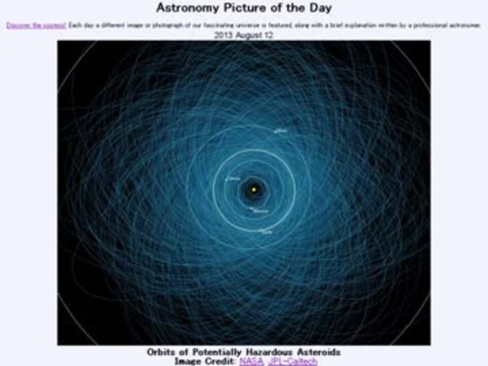 2013年8月12日 Astronomy Picture of the Day<br />Orbits of Potentially Hazardous Asteroids 「潜在的に危険な小惑星の軌道」です。<br /><br />APODとはNASAの天文学者が、毎日天文に関する画像に説明を添えて公開しているサイトです。<br />英語の勉強に読んでます。間違いがあれば指摘頂けると嬉しいです。<br /><br />美しい写真と原文<br /><a href="http://apod.nasa.gov/apod/ap130812.html" target="_blank" rel="noopener nofollow">http://apod.nasa.gov/apod/ap130812.html</a><br /><br />お借りした音源<br /><a href="https://commons.nicovideo.jp/works/nc75778" target="_blank" rel="noopener">nc75778</a>「黒幕の影」 by VFR<br /><br />APODreadingマイリスト <a href="https://www.nicovideo.jp/mylist/38905824" target="_blank" rel="noopener">mylist/38905824</a>(2013年8月分)<br />(<a href="https://www.nicovideo.jp/watch/sm21586892" class="watch">sm21586892</a><前日 翌日><a href="https://www.nicovideo.jp/watch/sm21602046" class="watch">sm21602046</a>)<br /><br />Twitter:Cc_jabberwock <br /><br />転載はご遠慮下さい。解らない事が有ったら気軽にお尋ね下さい。解る範囲内ですがお答えします