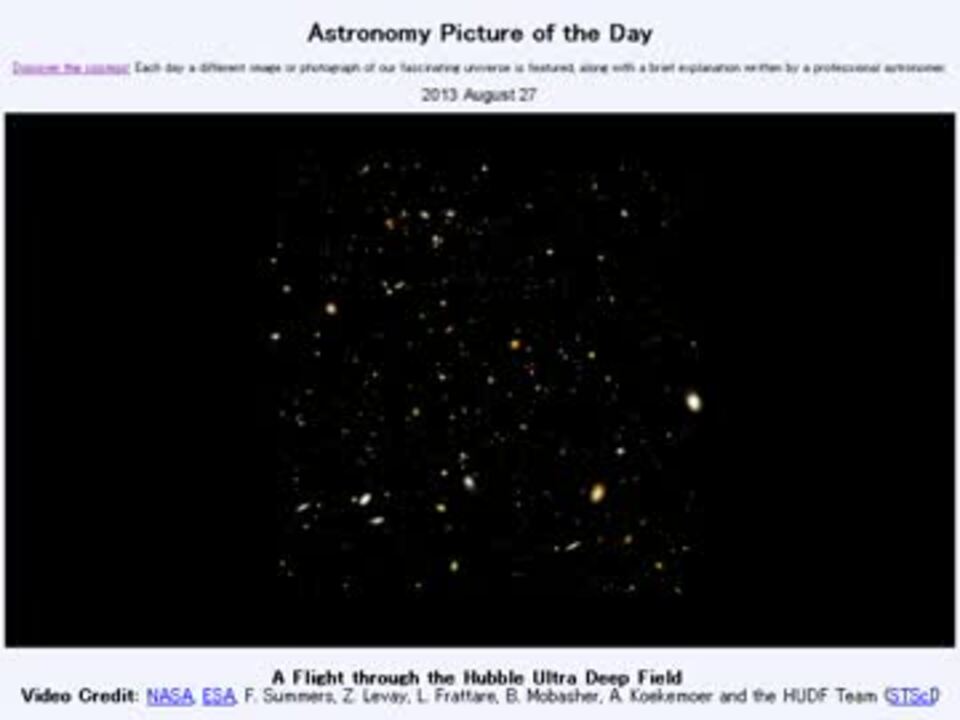 2013年 8月27日 Astronomy Picture of the Day<br />A Flight through the Hubble Ultra Deep Field 「ハッブル・ウルトラ・ディープ・フィールドを飛ぶ」です。<br /><br />APODとはNASAの天文学者が、毎日天文に関する画像に説明を添えて公開しているサイトです。<br />英語の勉強に読んでます。間違いがあれば指摘頂けると嬉しいです。<br /><br /><b>美しい写真と原文</b><br /><a href="http://apod.nasa.gov/apod/ap130827.html" target="_blank" rel="noopener nofollow">http://apod.nasa.gov/apod/ap130827.html</a><br /><b>お借りした素材</b><br />AstroBinより<br />"M31" by Steve Yan<br /><b>お借りした音源</b><br /><a href="https://commons.nicovideo.jp/works/nc70056" target="_blank" rel="noopener">nc70056</a>「ほしのこえ」 by 島白<br /><br />APODreadingマイリスト <a href="https://www.nicovideo.jp/mylist/38905824" target="_blank" rel="noopener">mylist/38905824</a>(2013年8月分)<br />(<a href="https://www.nicovideo.jp/watch/sm21700452" class="watch">sm21700452</a><前日 翌日><a href="https://www.nicovideo.jp/watch/sm21710023" class="watch">sm21710023</a>)<br /><br />Twitter:Cc_jabberwock <br /><br />転載はご遠慮下さい。解らない事が有ったら気軽にお尋ね下さい。解る範囲内ですがお答えします
