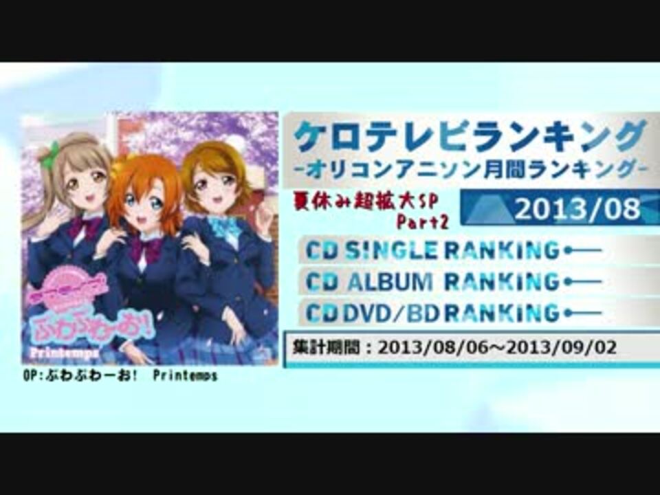 [HP]<a href="http://www20.atwiki.jp/keroro00innovator/" target="_blank" rel="noopener nofollow">http://www20.atwiki.jp/keroro00innovator/</a><br />デイリー:<a href="http://www20.atwiki.jp/keroro00innovator/pages/25.html" target="_blank" rel="noopener nofollow">http://www20.atwiki.jp/keroro00innovator/pages/25.html</a><br />週間:<a href="http://www20.atwiki.jp/keroro00innovator/pages/26.html" target="_blank" rel="noopener nofollow">http://www20.atwiki.jp/keroro00innovator/pages/26.html</a><br />2013年8月度のランキングです。<br />基本的にアニメソングのみ。除外基準:<a href="http://www20.atwiki.jp/keroro00innovator/pages/4.html" target="_blank" rel="noopener nofollow">http://www20.atwiki.jp/keroro00innovator/pages/4.html</a><br />2013年7月:<a href="https://www.nicovideo.jp/watch/sm21528586" class="watch">sm21528586</a> 2013年9月:<a href="https://www.nicovideo.jp/watch/sm21950354" class="watch">sm21950354</a> ランキング一覧:<a href="https://www.nicovideo.jp/mylist/22696553" target="_blank" rel="noopener">mylist/22696553</a><br /><br /><b><font size=+1 color=red>今月も夏休み拡大SP!</font> 特別にシングル45位・アルバム11位まで公開!</b>
