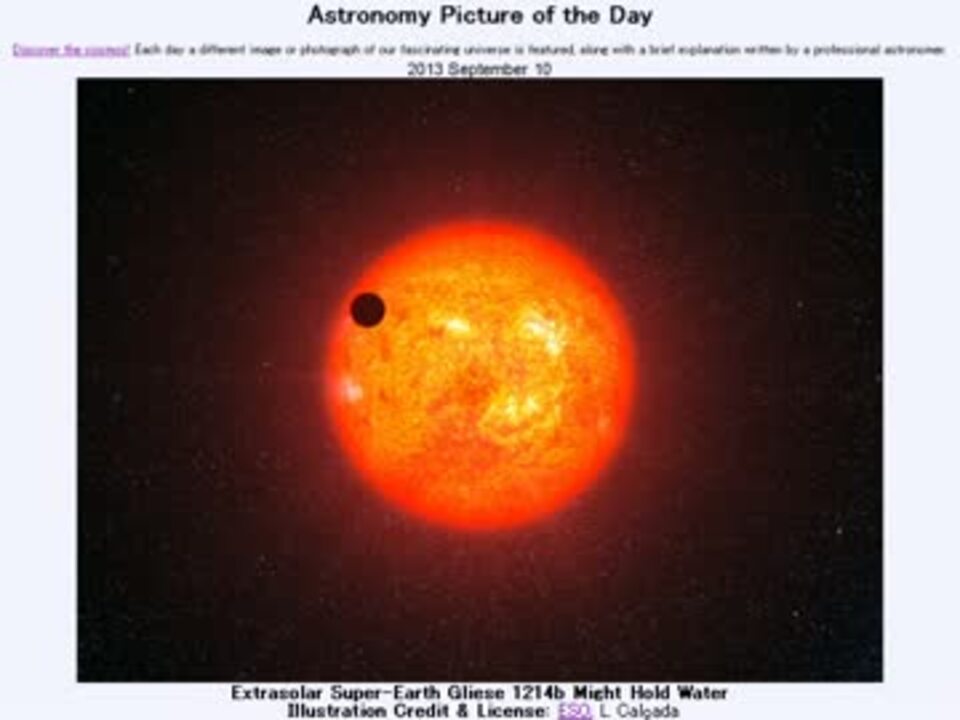 <b>2013年 9月10日 Astronomy Picture of the Day<br />Extrasolar Super-Earth Gliese 1214b Might Hold Water 「水が存在する可能性のある巨大地球型系外惑星:グリーゼ1214b」</b><br /><br />APODとはNASAの天文学者が、毎日天文に関する画像に説明を添えて公開しているサイトです。<br /><br /><b>美しい写真と原文</b><br /><a href="http://apod.nasa.gov/apod/ap130910.html" target="_blank" rel="noopener nofollow">http://apod.nasa.gov/apod/ap130910.html</a><br /><br /><b>お借りした音源</b><br /><a href="https://commons.nicovideo.jp/works/nc68329" target="_blank" rel="noopener">nc68329</a>「midday of wednesday」 by N.<br /><br />APODreadingマイリスト <a href="https://www.nicovideo.jp/mylist/32170692" target="_blank" rel="noopener">mylist/32170692</a> (<a href="https://www.nicovideo.jp/watch/sm21802494" class="watch">sm21802494</a><前日 翌日><a href="https://www.nicovideo.jp/watch/sm21816407" class="watch">sm21816407</a>)<br /><br />転載はご遠慮下さい。<br /><br />ささらさん回はこれにて終了です。音声の編集に2時間はかかるので、毎日やるには無理が有りました。<br />宣伝して頂いたのに申し訳有りませんです。棒読み並に楽になればまた使うかもしれません。