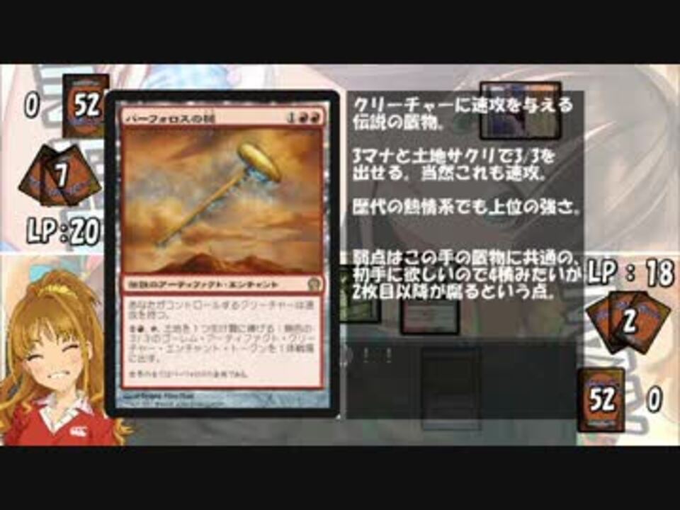 新スタンダード一本。トリココンvsハンマーズ。<br />テーロス参入後からスタンに復帰します。でも動画は今後も昔のデッキ多めかも。<br /><br />復帰のために次の環境で使うカード買おうとカードショップに行ったところ、初心者と思われる二人組がストレージの前でギルド門を買い漁り、ストレージに放られてる神話ファッティを見て「やべー超強い200円とか奮発して買うわ」「マジかよ俺もなんか強いの買わなきゃ勝てんじゃん」とか言っててほっこりしました。<br /><br />いいなぁ……ああいうマジックしたいなぁ……。(家に帰って啓示評決霊異種をポチりつつ)<br /><br />Q.おい、啓示の説明。<br />A.ゲインしてドローが正解です。てへぺろ☆<br /><a href="https://www.nicovideo.jp/watch/sm21769654" class="watch">sm21769654</a><前 次><a href="https://www.nicovideo.jp/watch/sm22011185" class="watch">sm22011185</a> レシピ><a href="https://www.nicovideo.jp/watch/sm21872677" class="watch">sm21872677</a> 一覧<a href="https://www.nicovideo.jp/mylist/38083705" target="_blank" rel="noopener">mylist/38083705</a>
