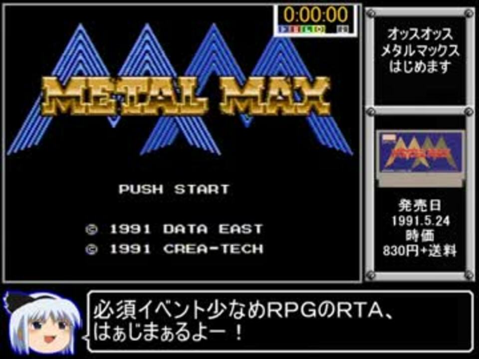 RTA第二十三弾は『メタルマックス』です。<br />RTAじゃあ、ちっとも寄り道ができないじゃないか(憤慨)<br /><br />ルールは、防御キャンセルあり・HPSP攻撃力に関するバグ利用なし、です。<br /><br />KBN兄貴兄貴、ABRNN兄貴、KLS兄貴、PRKT兄貴、STU兄貴、RCY兄貴、KUIC兄貴、BORNT兄貴、SR兄貴、おっさん、JNYKTGW兄貴、TNK兄貴、HNT兄貴、NM兄貴、BBC兄貴、SMR兄貴、宣伝アリシャス!<br />これの2って、ファミコンにないんですかね?<br /><br />スタート~ビッグキャノン撃破まで<br />part2→<a href="https://www.nicovideo.jp/watch/sm21869029" class="watch">sm21869029</a><br /><br />自作RTA動画Part1集 <a href="https://www.nicovideo.jp/mylist/35526961" target="_blank" rel="noopener">mylist/35526961</a><br />ファミコンと化した先輩一覧 <a href="https://www.nicovideo.jp/mylist/35527044" target="_blank" rel="noopener">mylist/35527044</a><br />作った動画全部 <a href="https://www.nicovideo.jp/mylist/24972054" target="_blank" rel="noopener">mylist/24972054</a><br />