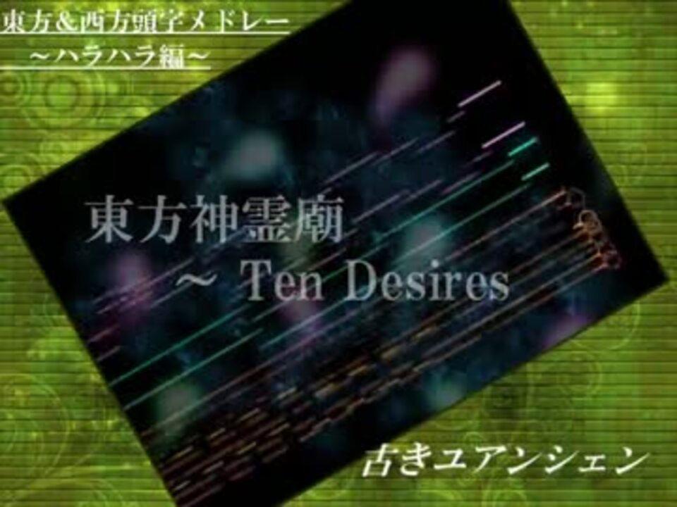 ねりすずめです。ハラハラしますよ。<br /><br />*このシリーズは東方旧作~東方神霊廟と音楽CD、秋霜玉、稀翁玉から全曲選んでいるつもりですがたまに抜け落ちてたりします。<br />*動画中に7つ、流星が現れます。全部見れた方はきっといい事があるはず・・・<br /><br /><b>■東方頭字メドレーマイリスト<br /><a href="https://www.nicovideo.jp/mylist/29373758" target="_blank" rel="noopener">mylist/29373758</a><br /></b><br />■ホームページ<br /><a href="http://zepto.main.jp/" target="_blank" rel="noopener nofollow">http://zepto.main.jp/</a><br /><br />■ブログ<br /><a href="http://miiry569.blog58.fc2.com/" target="_blank" rel="noopener nofollow">http://miiry569.blog58.fc2.com/</a><br /><br />■twitter<br /><a href="https://twitter.com/_zepto" target="_blank" rel="noopener nofollow">https://twitter.com/_zepto</a><br /><br />■そのほかの作品<br /><a href="https://www.nicovideo.jp/mylist/18638186" target="_blank" rel="noopener">mylist/18638186</a><br />