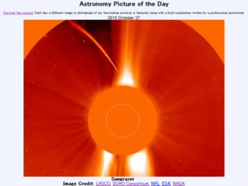 <b>2013年 10月27日 Astronomy Picture of the Day<br />Sungrazer 「サングレーザー」</b><br /><br />APODとはNASAの天文学者が、毎日天文に関する画像に説明を添えて公開しているサイトです。<br />英語の勉強に読んでます。間違いがあれば指摘頂けると嬉しいです。<br /><br /><b>美しい写真と原文</b><br /><a href="http://apod.nasa.gov/apod/ap131027.html" target="_blank" rel="noopener nofollow">http://apod.nasa.gov/apod/ap131027.html</a><br /><b>お借りした素材</b><br />Wikipediaより<br />"Solar eclipse 1999 4 NR" by Luc Viatour /www.Lucnix.be<br />"Christmas Comet Lovejoy Captured at Paranal" by ESO/Guillaume Blanchard<br />"Kreutz Group fragmentation hierarchy en" by Minami Himemiya<br /><b>お借りした音源</b><br /><a href="https://commons.nicovideo.jp/works/nc77419" target="_blank" rel="noopener">nc77419</a>「嫌な事件だったね」 by VFR<br /><br />APODreadingマイリスト <a href="https://www.nicovideo.jp/mylist/32170692" target="_blank" rel="noopener">mylist/32170692</a> (<a href="https://www.nicovideo.jp/watch/sm22144605" class="watch">sm22144605</a><前日 翌日><a href="https://www.nicovideo.jp/watch/sm22153770" class="watch">sm22153770</a>)<br /><br />転載はご遠慮下さい。解らない事が有ったら気軽に聞いてみて下さい。調べてきます