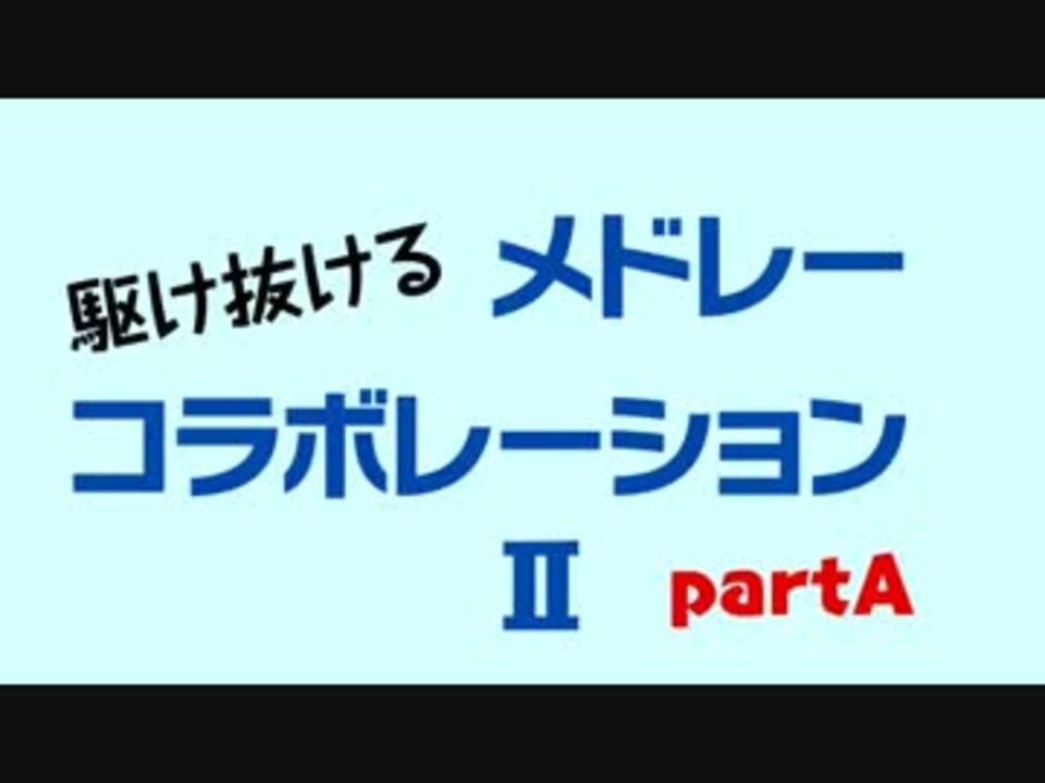 <font color="red" size="5">前作(<a href="https://www.nicovideo.jp/watch/sm18639234" class="watch">sm18639234</a>)から1年、あの伝説の合作が帰ってきた!</font><br /><br />というわけで、メドレー製作者18人の手により、まさかまさかの「駆け抜ける」合作第2弾が完成しました!<br />個性豊かな繋ぎと選曲を存分にご堪能ください<br />前作と同様に、カオスで"何でもアリ"なメドレーなので不快に思われる方は直ちに視聴を中止してください!<br /><br /><b>後半→<a href="https://www.nicovideo.jp/watch/sm22160056" class="watch">sm22160056</a></b><br /><br />===参加者一覧(敬称略)===<br /><br />銀河P、☆ありゅ☆、laple、8:51:22pm、わさぼう、こたつ型扇風機、しらす、えっとぉ、<br />FLAG、きば、僭越、タイヤヤ、ふうりん、Frog96、綿犬、ジコ、メスシリンダー、2÷す、M.Iz<br />主催: 銀河P<br />MIX: YASU<br />動画: みおん<br />監修: M.Iz<br /><br /><b>参加者マイリスト⇒<a href="https://www.nicovideo.jp/mylist/38646344" target="_blank" rel="noopener">mylist/38646344</a> </b>