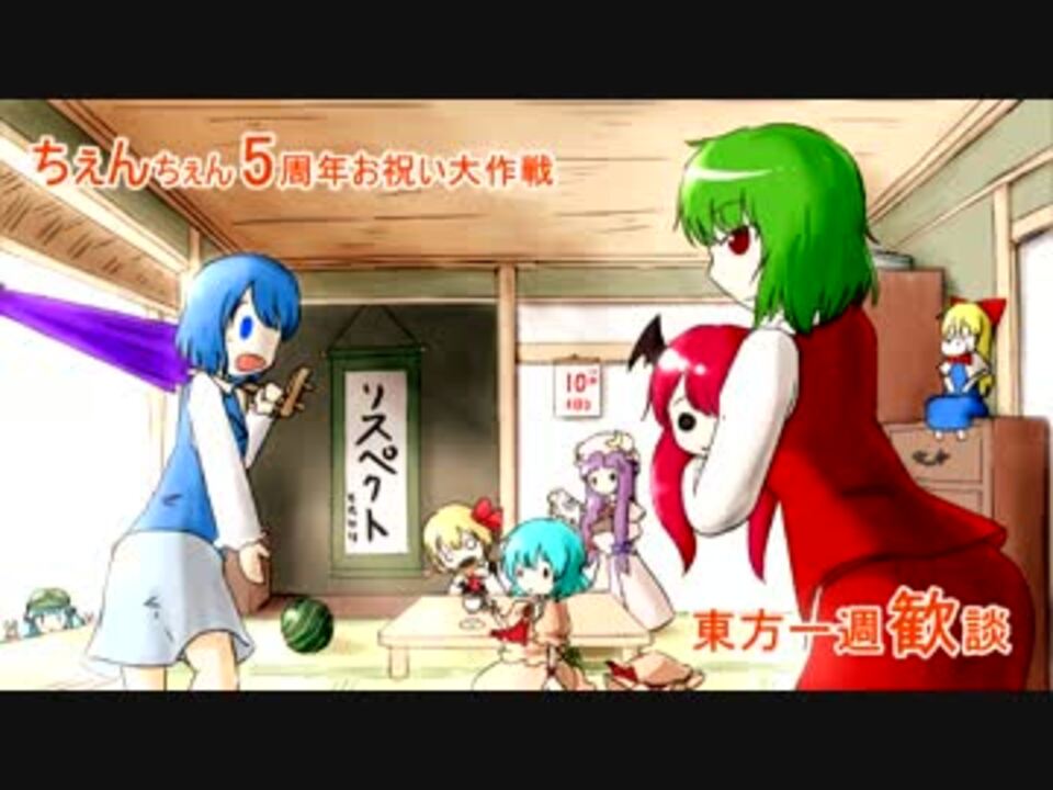 地を超え時を超え、集いし週間投稿者達が<br />5年越えの化け猫「ちぇん」にお祝いを挑む。<br />一大リスペクタクル!大歓談の末に祝い残るのは果たして…<br /><br />【出演】<br /> 月…小傘(cvたいき)<a href="https://www.nicovideo.jp/mylist/17972139" target="_blank" rel="noopener">mylist/17972139</a><br /> 月…レミリア(cv何か)<a href="https://www.nicovideo.jp/mylist/22208205" target="_blank" rel="noopener">mylist/22208205</a><br /> 火…幽香(cv糸工)<a href="https://www.nicovideo.jp/mylist/22103709" target="_blank" rel="noopener">mylist/22103709</a><br /> 水…たこぁ&レミリア(cvいちごあめ)<a href="https://www.nicovideo.jp/mylist/23546672" target="_blank" rel="noopener">mylist/23546672</a><br /> 木…にとり(cvジョナ)<a href="https://www.nicovideo.jp/mylist/21904151" target="_blank" rel="noopener">mylist/21904151</a><br /> 木…ルーミア(cv虎太郎)<a href="https://www.nicovideo.jp/mylist/22493966" target="_blank" rel="noopener">mylist/22493966</a><br /> 土…咲夜(cvたいれる)<a href="https://www.nicovideo.jp/mylist/15306779" target="_blank" rel="noopener">mylist/15306779</a><br /> 毎…パチュリー(cvふみ切)<a href="https://www.nicovideo.jp/mylist/28335878" target="_blank" rel="noopener">mylist/28335878</a><br /> 犬…シャンハイ(cvとたけけ)<a href="https://www.nicovideo.jp/mylist/22032024" target="_blank" rel="noopener">mylist/22032024</a><br /> その他見覚えのある方々…うっ頭が!<br /><br />【企画、立案、シナリオ、お祝い】<br /> ジョナ<br /><br />【OP、ED、編集、演出、リスペ】<br /> とたけけ
