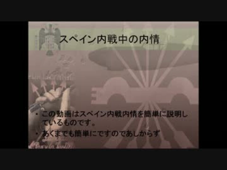 悪ふざけの続き!!<br />前回に続き勢いだけですので結構雑が見られます!<br /><br />簡単に説明するの難しいんだぜ<br />少しでもスペインという国に興味を持っていただけたらそれで幸せです<br /><br /><br />前回の動画→<a href="https://www.nicovideo.jp/watch/sm22254212" class="watch">sm22254212</a><br />HOI2動画<a href="https://www.nicovideo.jp/mylist/39228072" target="_blank" rel="noopener">mylist/39228072</a>→今まで上げた動画マイリスト<a href="https://www.nicovideo.jp/mylist/29276069" target="_blank" rel="noopener">mylist/29276069</a>スペイン内戦HOI動画→<a href="https://www.nicovideo.jp/watch/sm22202534" class="watch">sm22202534</a>