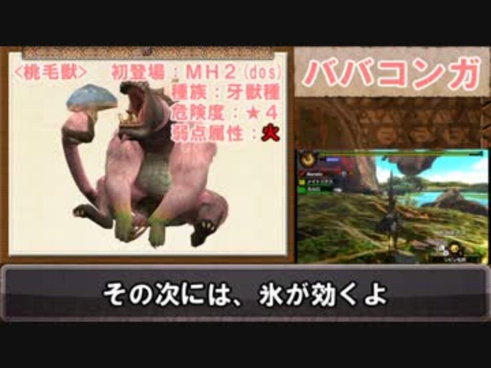 ババコンガはバナナがすごく似合うと思う<br><br>注意<br>・実況:解説=7:3くらい<br> ・攻略、立ち回りなどについての解説動画ではありません<br> ・ノイズが少し入ってます<br> ・お嫌いな方はブラウザバックしてください<br><br>※追記:桃毛獣の読みを「ももけじゅう」【MH2(dos)での読み方】で紹介していますが、MH4では「ももげじゅう」と読むようです。<br><br>前→<a href="https://www.nicovideo.jp/watch/sm22304842" class="watch">sm22304842</a> マイリスト→<a href="https://www.nicovideo.jp/mylist/38904337" target="_blank" rel="noopener">mylist/38904337</a> 次→<a href="https://www.nicovideo.jp/watch/sm22461920" class="watch">sm22461920</a><br> 他のゆっくり実況→<a href="https://www.nicovideo.jp/mylist/35671399" target="_blank" rel="noopener">mylist/35671399</a><br>モンハン解説→<a href="https://www.nicovideo.jp/mylist/38484481" target="_blank" rel="noopener">mylist/38484481</a><br> Twitter:akaromio<br>