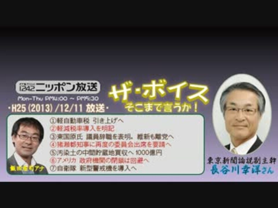今週は『あさラジ、ザ・ボイス、ズーム』の3番組連動で(ry)長谷川さんは、政府・与党の『特定秘密保護法案』の議論の進め方について苦言を呈されました。とはいえ、所属の東京新聞みたいな「廃案、断固反対!」というヒステリックなものではなく、いつものように論理的で一理アルミンなものでしたのでご安心を。<br />ほんと、この方が主流派になれば東京新聞もマトモになるだろうにねぇ~って、あれ、そういや肝心の評価・採点は!?w<br /><br />(敬称略)<br />①高橋洋一:<a href="https://www.nicovideo.jp/watch/sm22420887" class="watch">sm22420887</a><br />②勝谷誠彦:<a href="https://www.nicovideo.jp/watch/sm22421689" class="watch">sm22421689</a><br />③須田慎一郎:<a href="https://www.nicovideo.jp/watch/sm22426246" class="watch">sm22426246</a><br />④宮崎哲弥:<a href="https://www.nicovideo.jp/watch/sm22427831" class="watch">sm22427831</a><br />⑤富坂聡:<a href="https://www.nicovideo.jp/watch/sm22432336" class="watch">sm22432336</a><br />⑥長谷川幸洋:<b>ここ</b><br />⑦石破茂:<a href="https://www.nicovideo.jp/watch/sm22438172" class="watch">sm22438172</a><br />⑧青山繁晴:※別のうp主<br />⑨佐藤優:<a href="https://www.nicovideo.jp/watch/sm22444001" class="watch">sm22444001</a><br />⑩辛坊治郎:<a href="https://www.nicovideo.jp/watch/sm22452329" class="watch">sm22452329</a><br />□<a href="https://www.nicovideo.jp/mylist/36340069" target="_blank" rel="noopener">mylist/36340069</a>