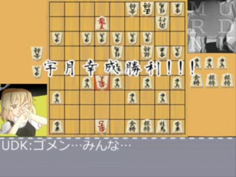 よく桂馬と香車の成りが一緒ってコメントがありますが、素材用に切り抜いた画像の将棋の駒がどうも同じ字になっているようです☆<br />まあ流れ見てりゃ大体わかるし、大丈夫だって安心しろよ~。ヘーキヘーキ、ヘーキだから!<br /><br />将棋に慣れたホモなら分かると思いますが、<a href="#" class="seekTime" data-seekTime="9:13" onclick="seekNicoPlayer('#9:13'); return false;">#9:13</a>からでもUDKは普通に勝てます。<br />もう少しUDKに経験があったら、また結果は違ってきていたのかもしれません。<br /><br />バリアンの白き盾兄貴・PKTentacle兄貴(六度目の)宣伝ありがとナス!<br /><br /><br />前回→<a href="https://www.nicovideo.jp/watch/sm22241103" class="watch">sm22241103</a><br />次回→<a href="https://www.nicovideo.jp/watch/sm22769862" class="watch">sm22769862</a><br /><br /><a href="https://www.nicovideo.jp/mylist/37213880" target="_blank" rel="noopener">mylist/37213880</a>