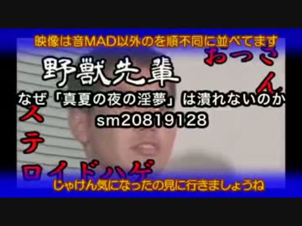 <font color="white">出来上がったのはこ、去年ですね<br />何故かUNEIに削除されて垢BANになってました(憤怒)</font><br />2013年中に投稿されて現在生存している音MADの中からランキング上位をピックアップしました。<br />クッキー☆、一転攻勢など多分に含んでいるので、淫夢のみMADをご所望の方はお気をつけ下さい。 <br />今回は1~6月まで取り上げてます。<br /><br />CMの部分には音MAD以外でランキング上位だったBB劇場や本編改造などを使わして頂きました。<br />2013年はいい年にできましたか・・・?<br /><br />下半期 > <a href="https://www.nicovideo.jp/watch/sm22605509" class="watch">sm22605509</a><br /><br />音MAD順 <a href="https://www.nicovideo.jp/mylist/39869310" target="_blank" rel="noopener">mylist/39869310</a><br />MAD以外 <a href="https://www.nicovideo.jp/mylist/39871318" target="_blank" rel="noopener">mylist/39871318</a>