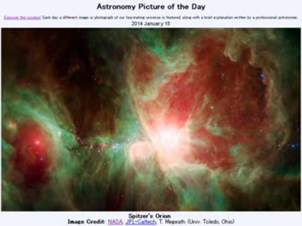 <b>2014年1月15日Astronomy Picture of the Day<br />Spitzer's Orion 「スピッツァーのオリオン」</b><br /><br />APODとはNASAの天文学者が、毎日天文に関する画像に説明を添えて公開しているサイトです。<br />英語の勉強に読んでます。間違いがあれば指摘頂けると嬉しいです。<br /><br /><b>美しい写真と原文</b><br /><a href="http://apod.nasa.gov/apod/ap140115.html" target="_blank" rel="noopener nofollow">http://apod.nasa.gov/apod/ap140115.html</a><br /><b>お借りした素材</b><br />FLickrより<br />"Orion nebula - Messier 42 - 5 hours worth" by Fred Locklear<br />Wikipediaより<br />"Forsterite-37005" by Rob Lavinsky<br /><b>お借りした音源</b><br /><a href="https://commons.nicovideo.jp/works/nc79382" target="_blank" rel="noopener">nc79382</a>「Electronic authentication」 by こおろぎ<br /><br />APODreadingマイリスト <a href="https://www.nicovideo.jp/mylist/32170692" target="_blank" rel="noopener">mylist/32170692</a> (<a href="https://www.nicovideo.jp/watch/sm22689551" class="watch">sm22689551</a><前日 翌日><a href="https://www.nicovideo.jp/watch/sm22704362" class="watch">sm22704362</a>)<br /><br />Twitter:Cc_jabberwock <br /><br />転載はご遠慮下さい。解らない事が有ったら気軽に聞いてみて下さい。調べてきます