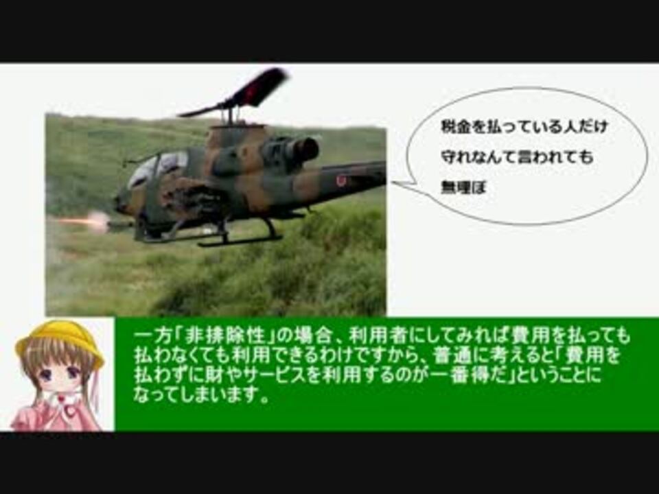 「タダより安いものはない」<br />誰かが得をしている裏で、誰かが損を被っているんですよね<br /><br />BGM TVアニメ「とある科学の超電磁砲」より<br />・放課後<br />・Tea Time<br />・学園都市の夕暮れ<br /><br />参考サイト<br />新世紀のビッグブラザーへ blog <a href="http://ameblo.jp/takaakimitsuhashi/" target="_blank" rel="noopener nofollow">http://ameblo.jp/takaakimitsuhashi/</a><br />代表戸締役 ◆jJEom8Ii3Eの妄言 <a href="http://blogs.yahoo.co.jp/daitojimari" target="_blank" rel="noopener nofollow">http://blogs.yahoo.co.jp/daitojimari</a><br />廣宮孝信の「国の借金」“新常識”<a href="http://grandpalais1975.blog104.fc2.com/" target="_blank" rel="noopener nofollow">http://grandpalais1975.blog104.fc2.com/</a><br /><br />Twitter @aiai_yukkuri_KZ<br />制作物<br /> 政治系MAD動画→<a href="https://www.nicovideo.jp/mylist/17279420" target="_blank" rel="noopener">mylist/17279420</a><br /> 経済講座シリーズ→<a href="https://www.nicovideo.jp/mylist/19534280" target="_blank" rel="noopener">mylist/19534280</a><br /> アニメ系MAD等→<a href="https://www.nicovideo.jp/mylist/22564233" target="_blank" rel="noopener">mylist/22564233</a><br /><br />前回「外部性」<a href="https://www.nicovideo.jp/watch/sm22746308" class="watch">sm22746308</a><br />次回(番外編)「まどか☆マギカと公共財」<a href="https://www.nicovideo.jp/watch/sm23001073" class="watch">sm23001073</a>