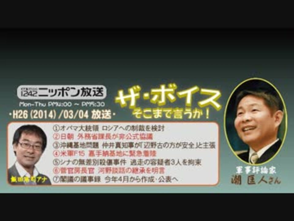 今週は宮崎さんがお休みのため、潮匡人さんがゲストとして~って、何というデジャブw<br />何かもう、宮崎さんの代役というのが板に付いてきた感じですね。<br /><br />さて、そんな潮さんが今回の『ザ・フォーカス』で取り上げたのは、元アメリカ国防長官であるゲーツ氏が出版した例の暴露本から、あの韓国・延坪島砲撃事件の"裏側"です。当時のアメリカは何を考え、どう干渉していたのかを解説しつつ、暗に「いつまでも国防をアメリカ頼みにしているとエラい目に遭いますよ!」と警鐘を鳴らしてくださいました。<br />この動画視聴者の方々には今更なネタでしょうが、一般リスナーさんには興味深い話だったと思います。いやほんと、憲法改正待ったなしですね。<br />※街ステ飛ばし→ <a href="#" class="seekTime" data-seekTime="38:48" onclick="seekNicoPlayer('#38:48'); return false;">#38:48</a><br />□<a href="https://www.nicovideo.jp/mylist/36340069" target="_blank" rel="noopener">mylist/36340069</a>□<a href="https://www.nicovideo.jp/mylist/41644857" target="_blank" rel="noopener">mylist/41644857</a>
