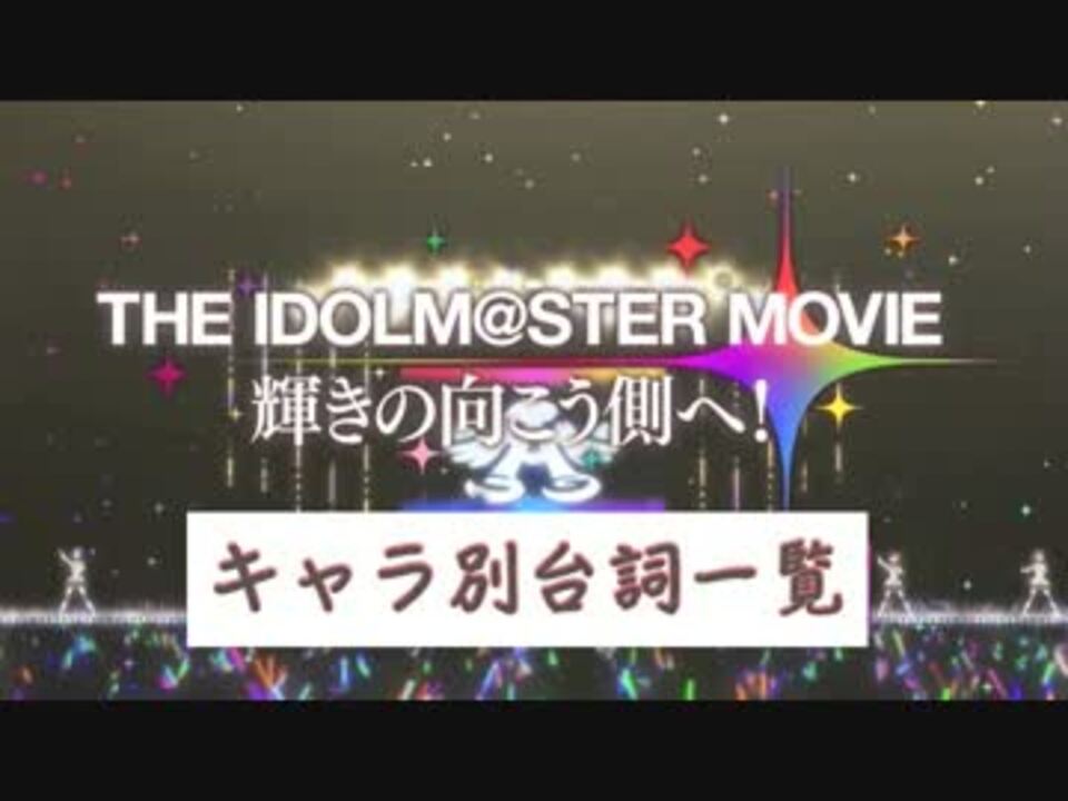 タイトルの通りです。劇場でスクリーンも見ずに必死にメモを取っている自分の姿は、周りから見ればさぞ滑稽に見えたことでしょう。95%くらい合ってると思います<br /><a href="https://www.nicovideo.jp/watch/sm23025257" class="watch">sm23025257</a>←台詞量を分析した動画<br />なお、本動画を作成している最中に若干のミスが発覚し、優遇度ランキングに少し変動がありました(真9位(同率)→10位、伊織5位→4位(同率))。具体的な内容は、真の台詞区切りミスと可奈の台詞カウントし忘れです。<br /><br />全台詞一覧を公開しました! 解説動画からDLしてください→<a href="https://www.nicovideo.jp/watch/sm24633578" class="watch">sm24633578</a><br />作成したもの→<a href="https://www.nicovideo.jp/mylist/45946662" target="_blank" rel="noopener">mylist/45946662</a><br />追記:「かな」で変換すると「可奈」になるのに「かなちゃん」で変換すると「加奈ちゃん」になるという罠<br />上腕三頭筋に大腿四頭筋…確かにそんな感じでした。情報提供感謝