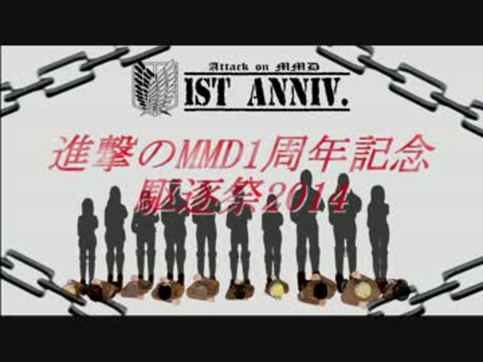 今年の5月で進撃のMMDが1周年を迎えます。<br />沢山の方と1周年を楽しく迎えたいと思い企画してみました。<br />その名も駆逐祭2014!!<br /><br />企画詳細についてはこちらのブロマガを確認してください→<a href="https://ch.nicovideo.jp/article/ar484695" target="_blank" rel="noopener">ar484695</a> <br /><br /><br />動画で案内しておりますが、企画用ロゴを配布下記で配布します。<br /><a href="http://bowlroll.net/up/dl34300" target="_blank" rel="noopener nofollow">http://bowlroll.net/up/dl34300</a> パス:kuchiku2014 <br /><br />お借りしたものは動画内で案内。<br />ニコニコして観ていただきたいのでご協力お願い致します。<br /><br />企画主催<br />3度の飯より寝るのが好き (<a href="https://www.nicovideo.jp/mylist/39887756" target="_blank" rel="noopener">mylist/39887756</a>)<br />みんみん (<a href="https://www.nicovideo.jp/mylist/33391296" target="_blank" rel="noopener">mylist/33391296</a>)<br />もこ (<a href="https://www.nicovideo.jp/mylist/38321946" target="_blank" rel="noopener">mylist/38321946</a>)<br />もってぃ (<a href="https://www.nicovideo.jp/mylist/34838272" target="_blank" rel="noopener">mylist/34838272</a>)<br />つこへたの人 (<a href="https://www.nicovideo.jp/mylist/35333592" target="_blank" rel="noopener">mylist/35333592</a>)<br />野生のイノシシ (<a href="https://www.nicovideo.jp/mylist/40833712" target="_blank" rel="noopener">mylist/40833712</a>)<br /><br />つこへたの人様の告知動画→<a href="https://www.nicovideo.jp/watch/sm23127070" class="watch">sm23127070</a>
