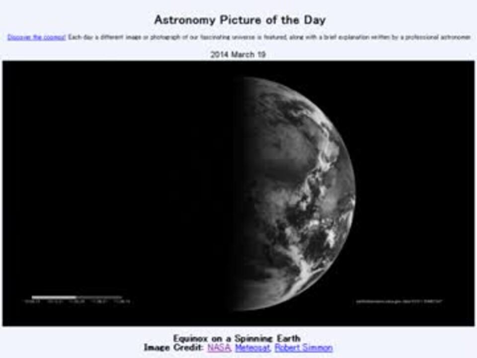 <b>2014年 3月19日 Astronomy Picture of the Day<br />Equinox on a Spinning Earth 「回る地球に現れた分点」</b><br /><br />APODとはNASAの天文学者が、毎日天文に関する画像に説明を添えて公開しているサイトです。<br />英語の勉強に読んでます。間違いがあれば指摘頂けると嬉しいです。<br /><br /><b>美しい写真と原文</b><br /><a href="http://apod.nasa.gov/apod/ap140319.html" target="_blank" rel="noopener nofollow">http://apod.nasa.gov/apod/ap140319.html</a><br /><b>お借りした音源</b><br /><a href="https://commons.nicovideo.jp/works/nc81673" target="_blank" rel="noopener">nc81673</a>「Teeth」 by VFR<br /><br />APODreadingマイリスト <a href="https://www.nicovideo.jp/mylist/32170692" target="_blank" rel="noopener">mylist/32170692</a> (<a href="https://www.nicovideo.jp/watch/sm23139653" class="watch">sm23139653</a><前日 翌日><a href="https://www.nicovideo.jp/watch/sm23162383" class="watch">sm23162383</a>)<br /><br />Twitter:Cc_jabberwock <br /><br />転載はご遠慮下さい。解らない事が有ったら気軽に聞いてみて下さい。調べてきます